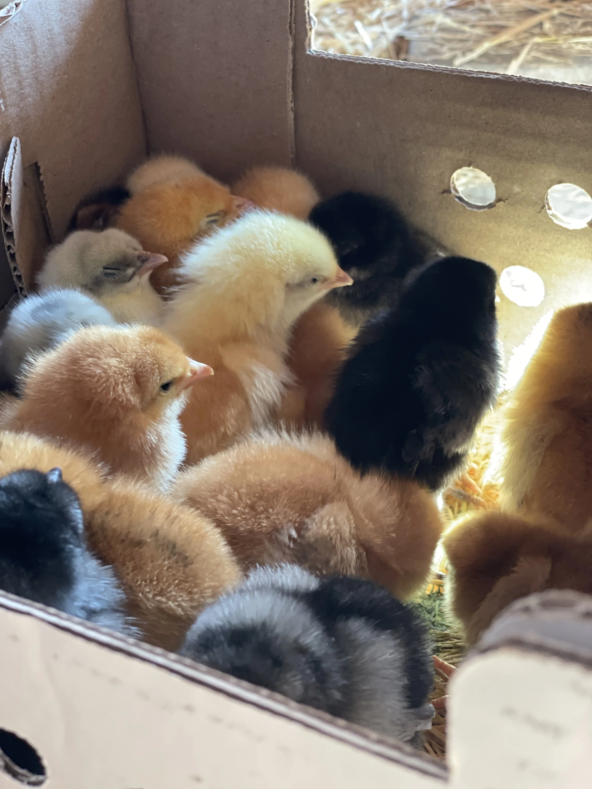 A few years ago we built a little hinged-top brooder that allows the chicks to be around the other birds, but still separated and safe for awhile. Inside we have a few waterers with extra electrolytes, some crumble chick food, and a heater (the plugged-in yellow thing in the middle.) The heater is adjustable up/down so they can go on the lower end or higher end, and we can raise it as they grow. This is the first time we are trying that type of warmer, something we saw at the homestead conference. It replaces hanging heat lamps, which always seem kind of dangerous.