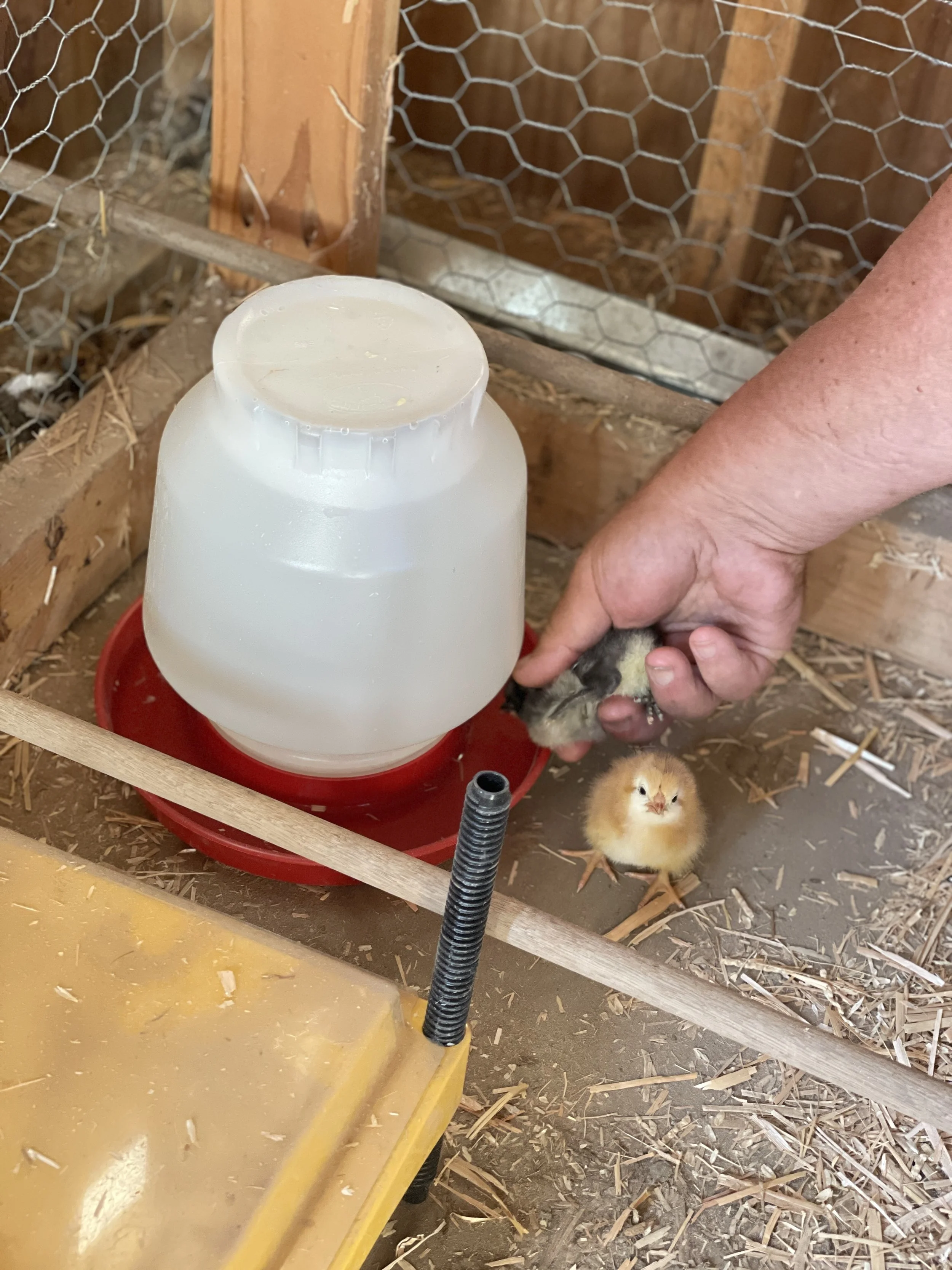 Now what we DIDN’T count on was the birds just squeezing right through the chicken wire! Especially in one sunny corner - they love that sun! We honestly don’t remember this happening before. Yet while we were getting them settled, boop! One just popped right out. This was not good! So we had to quickly rig up some extra hardware cloth around the edge to hopefully keep them safe. Within days they will be too big anyway, but still, why hadn’t this happened before? Weird.