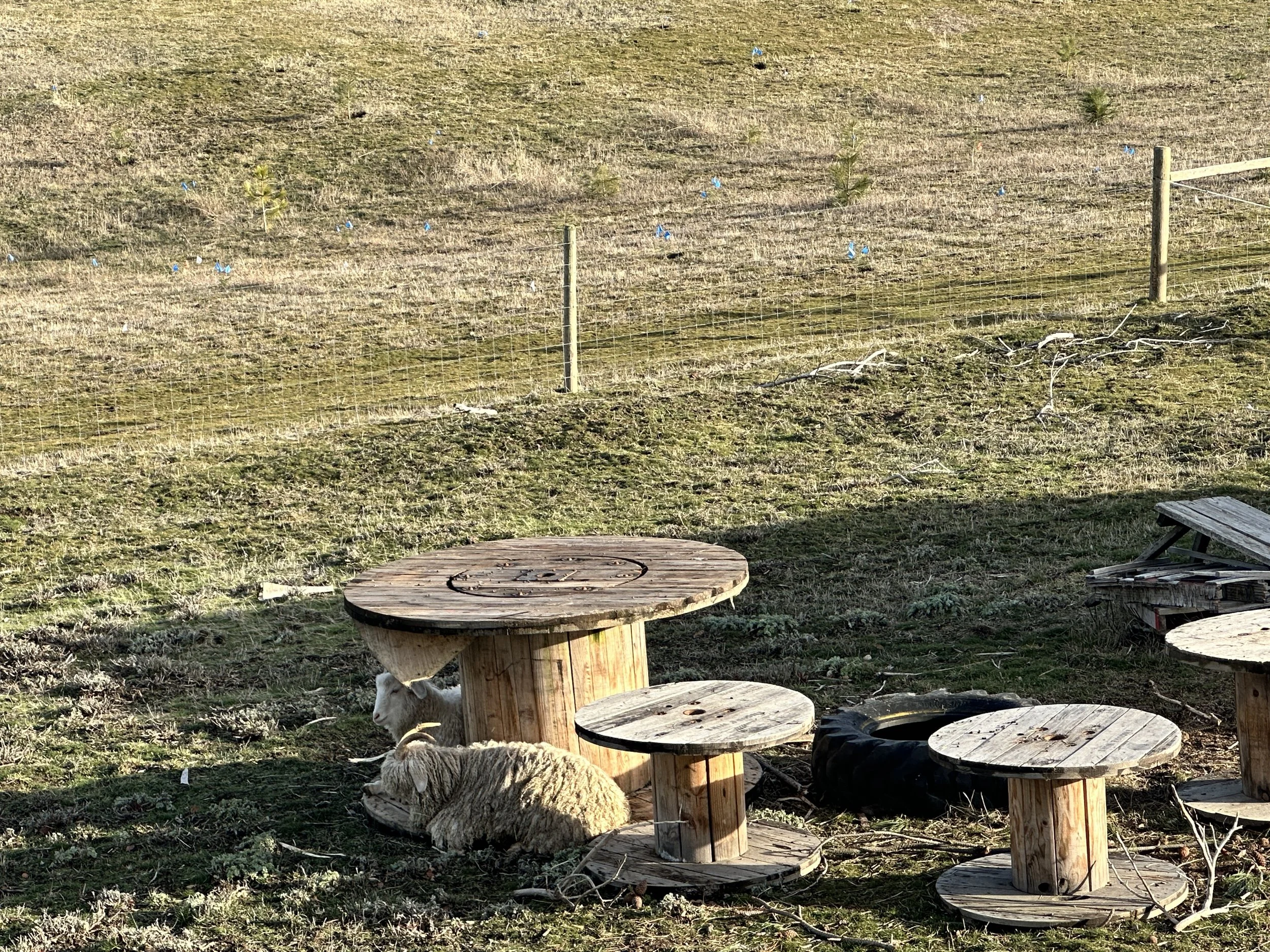 We got the large spool from a neighbor (It took all four of us to roll and drag it onto a trailer - it was HEAVY!) The goats think it is some kind of umbrella and prefer to lay under it instead of on top of it.