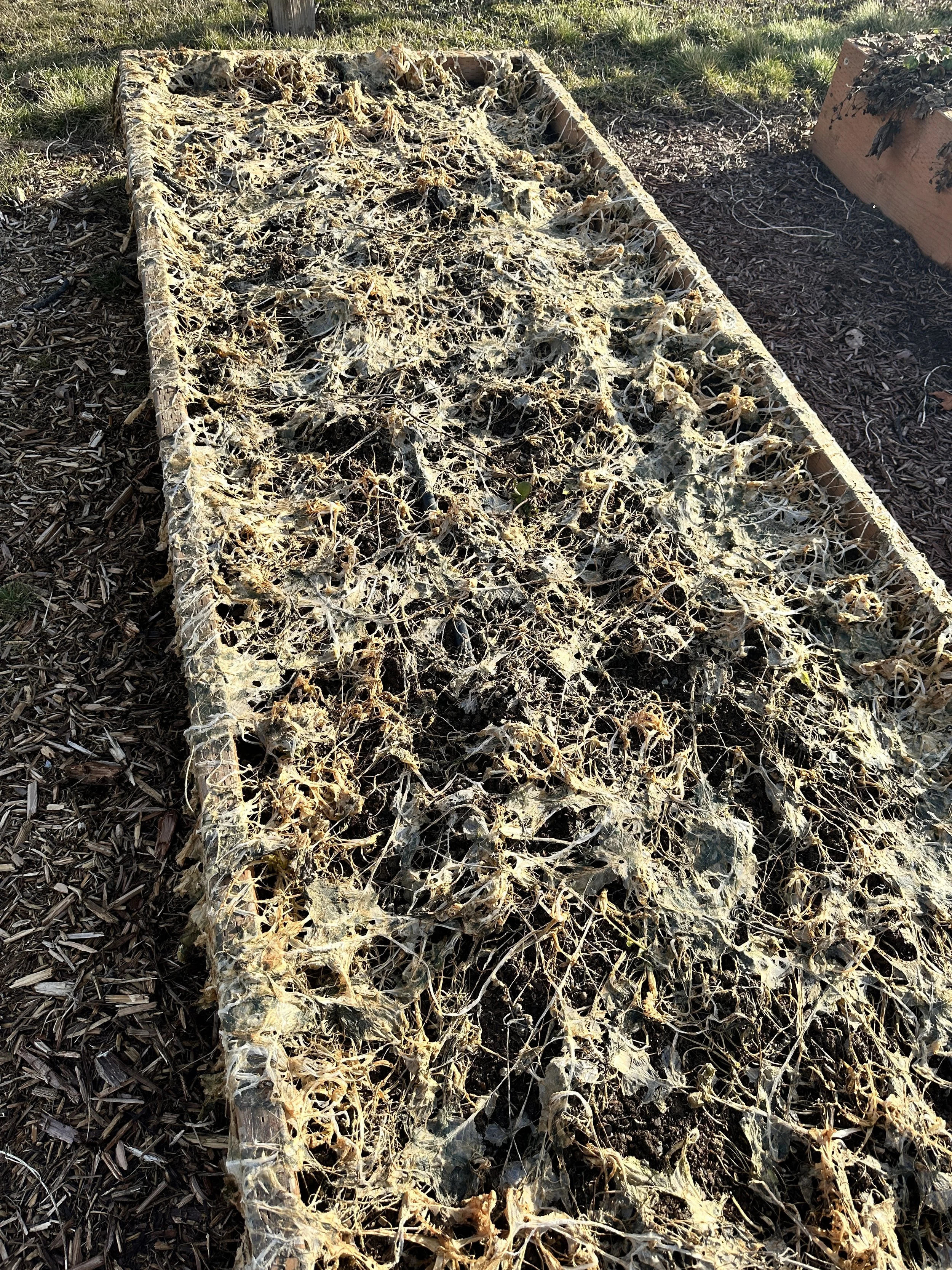 Now THIS bed is what cover crops are supposed to look like. This is covered with a daikon radish crop, and it died out as expected when we got our first hard frost. It will protect and feed the soil all winter.