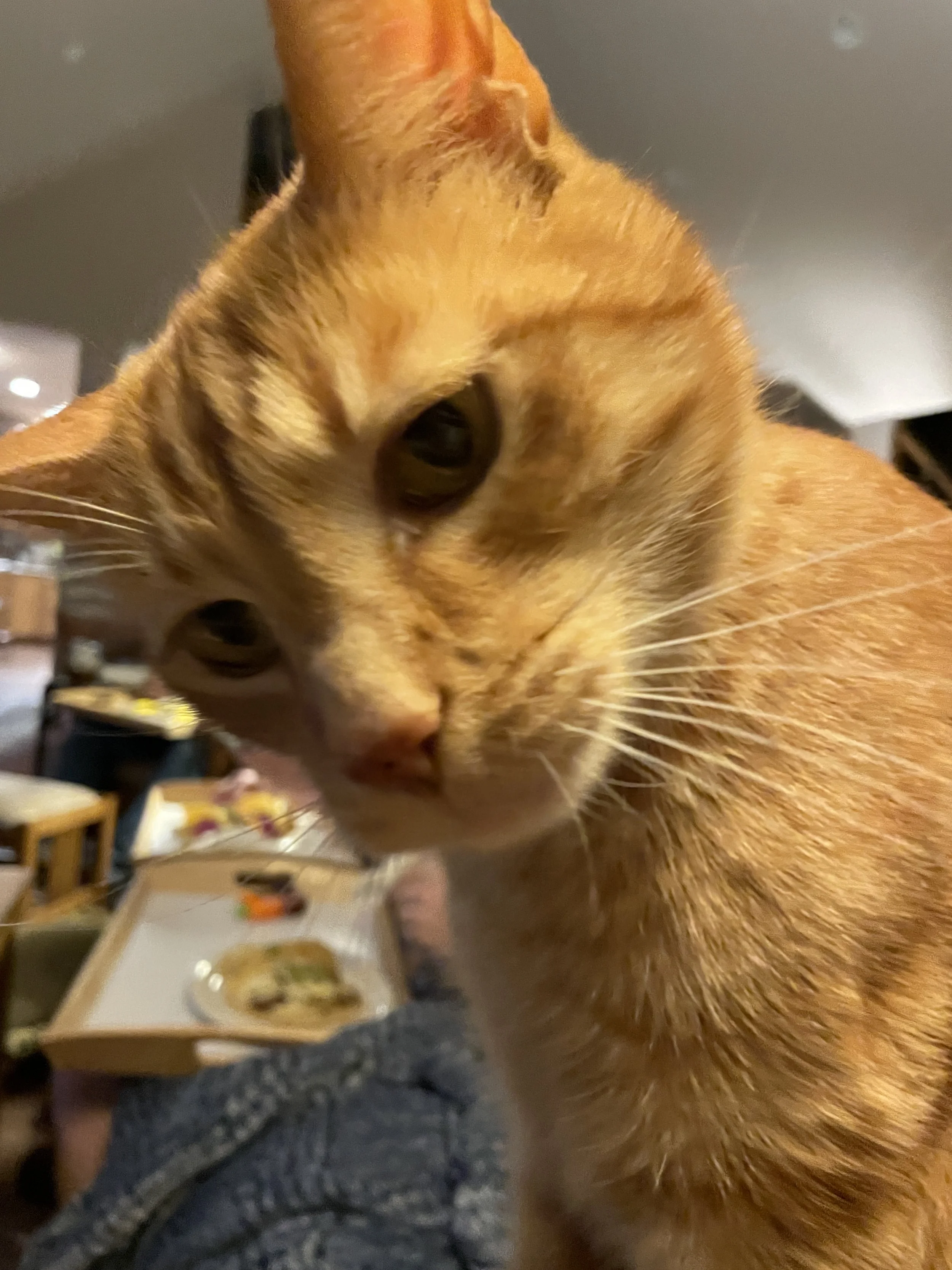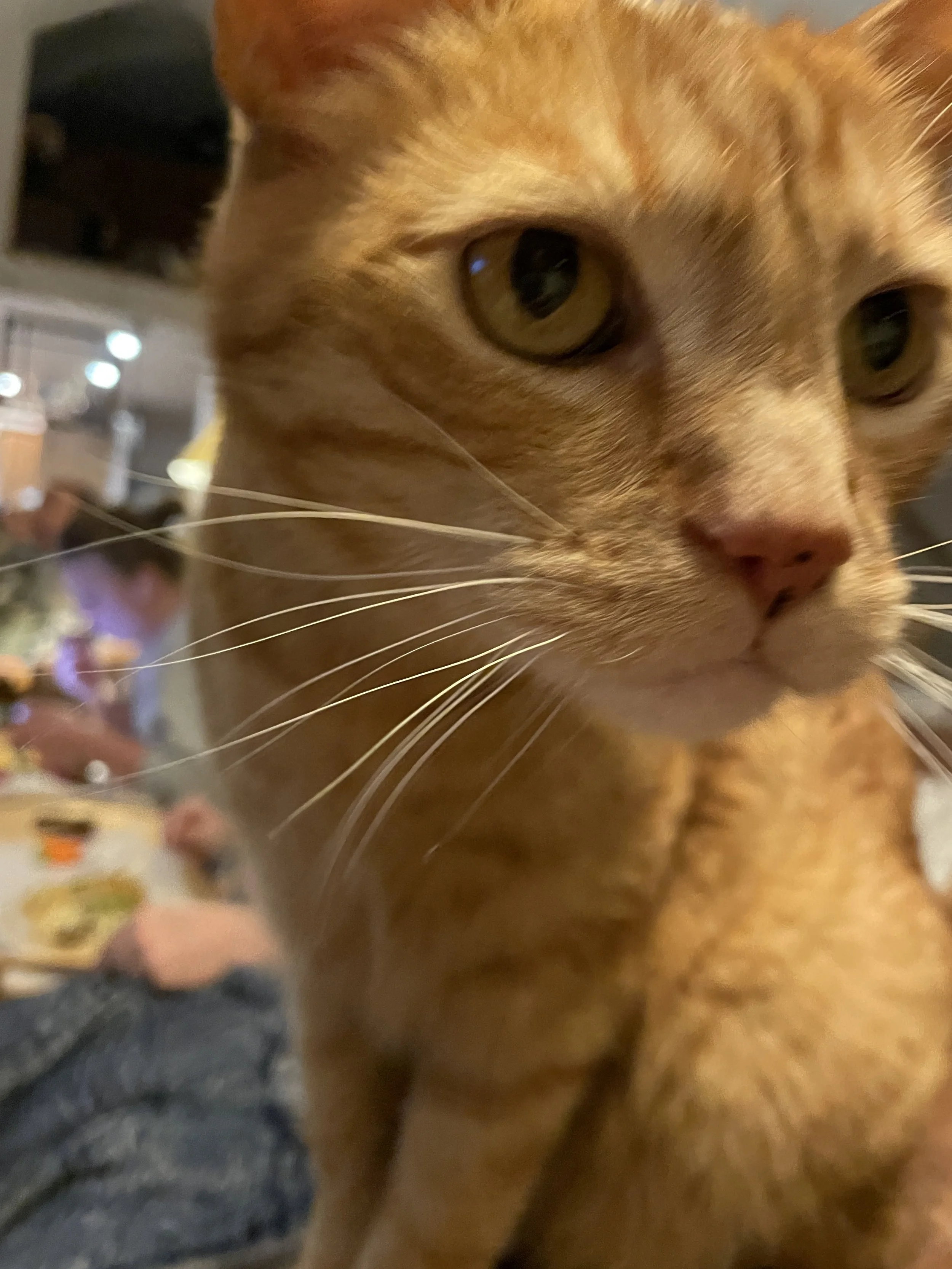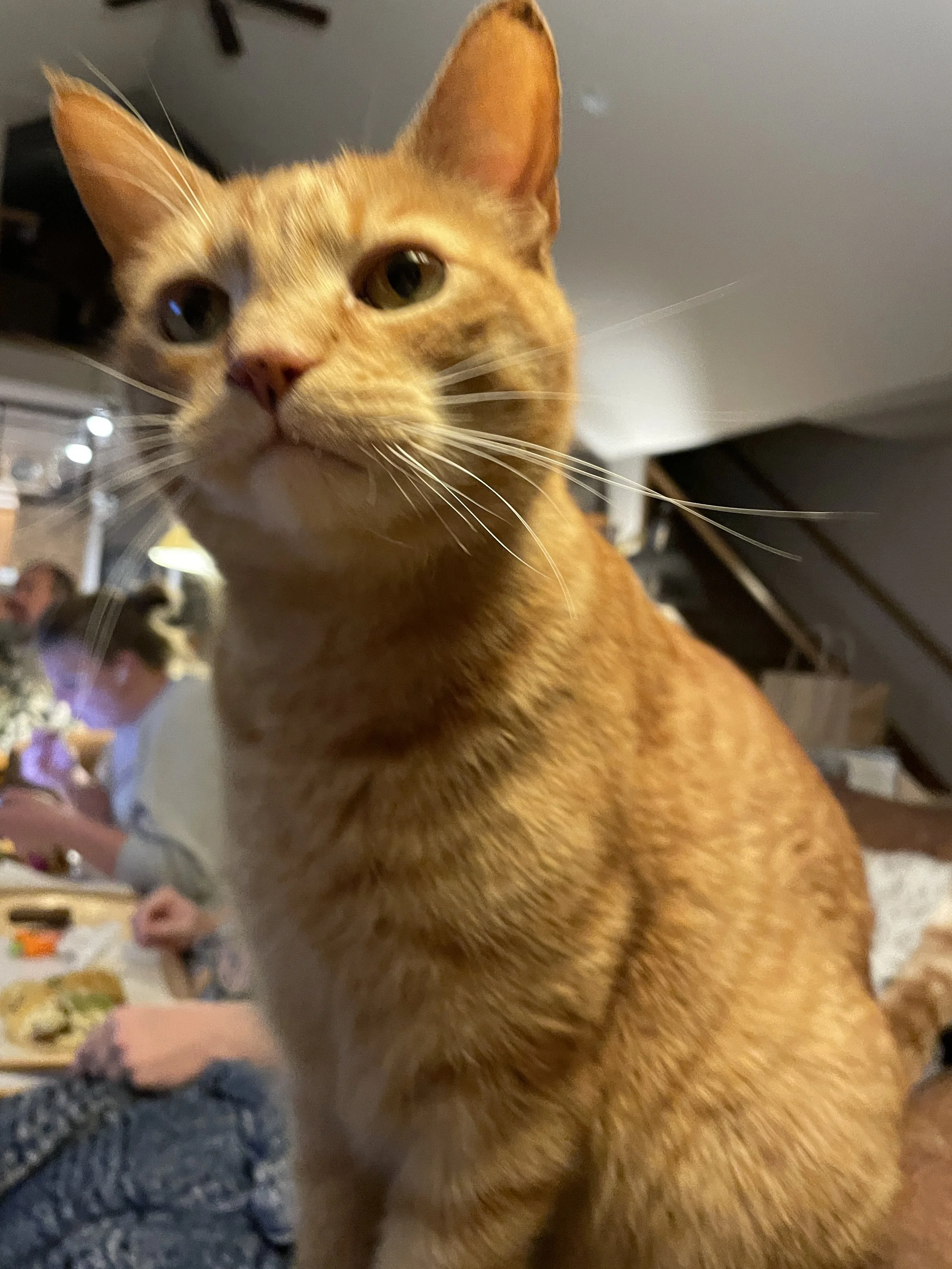 Chester started out as a feral rescue, became a die-hard outdoor barn cat, and ended up a really couch-loving, great indoor-outdoor pet. When we have family dinner movie nights, Montana and Elijah sit on the couch, and Chester sits right next to them. This was from last weekend’s meal and a movie. Shout out to Steve’s homemade tortillas and tacos in the background.