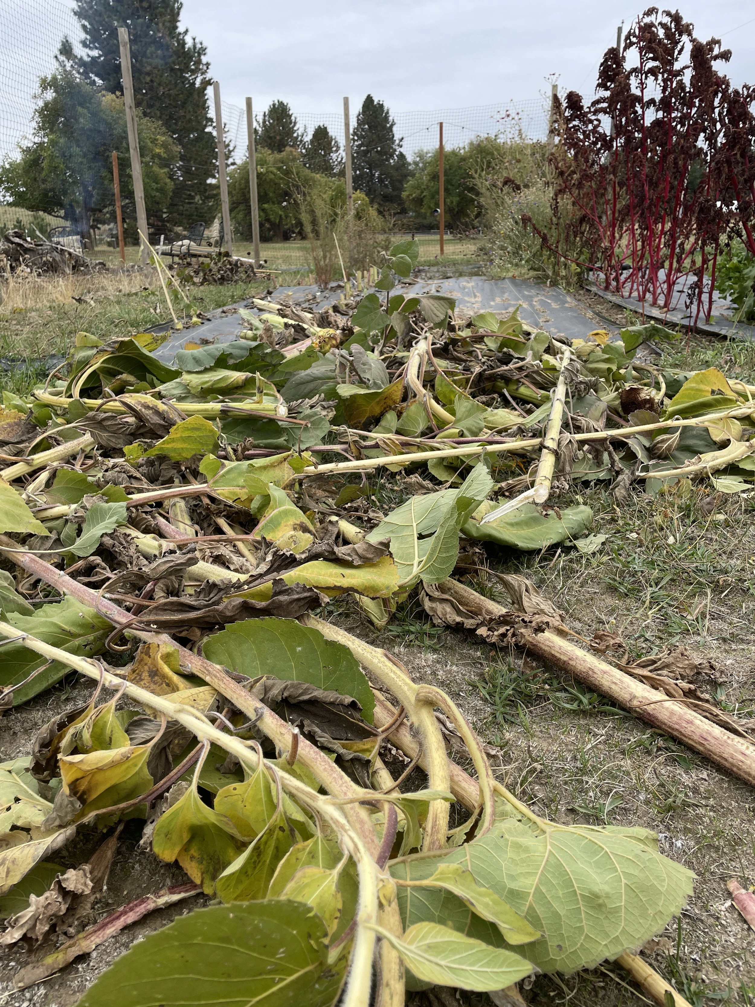 Steve used his new machete to chop down the sunflower stalks in the left-hand bed. They are formidable! He cut off the flower heads, and I gave those to the chickens. I will let the stalks dry out a bit more, and then I will pull off the remaining leaves and stack them up for Montana to use for her trellis projects next year.