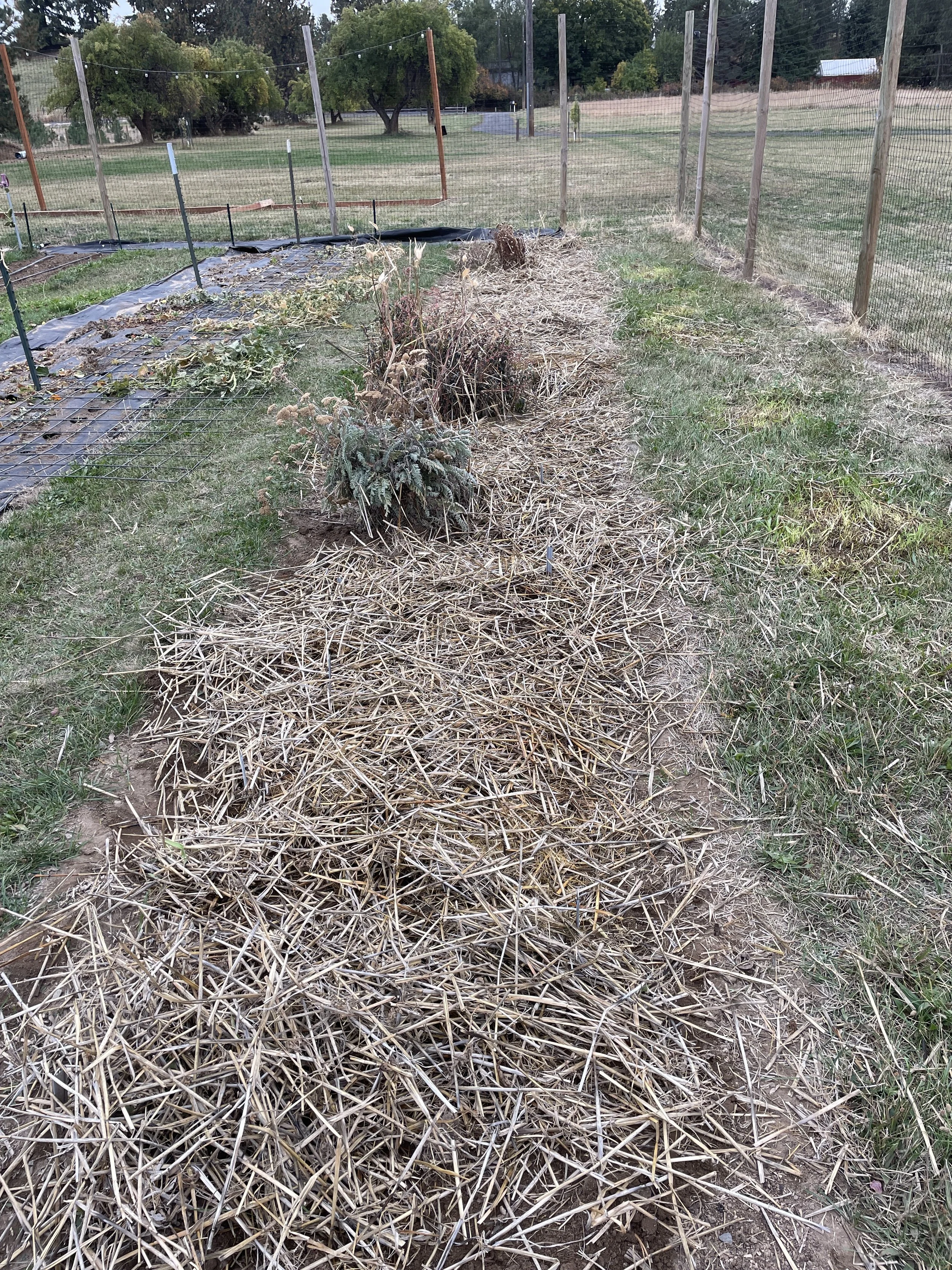 The right-hand bed is being repurposed to hold a few perennials and some bulbs. So we got the bulbs planted and then recovered the area with some straw. It is the one bed in the garden that does not have any kind of fabric barrier, and I predict I will HATE having to weed it. That landscape fabric is THE KEY to being able to maintain the garden space. But with bulbs popping up who-knows-where, it’s just not conducive to an orderly landscape-fabric’d space. So we will see! 50-50 odds that we will end up tilling this area up and planting something else here next summer.