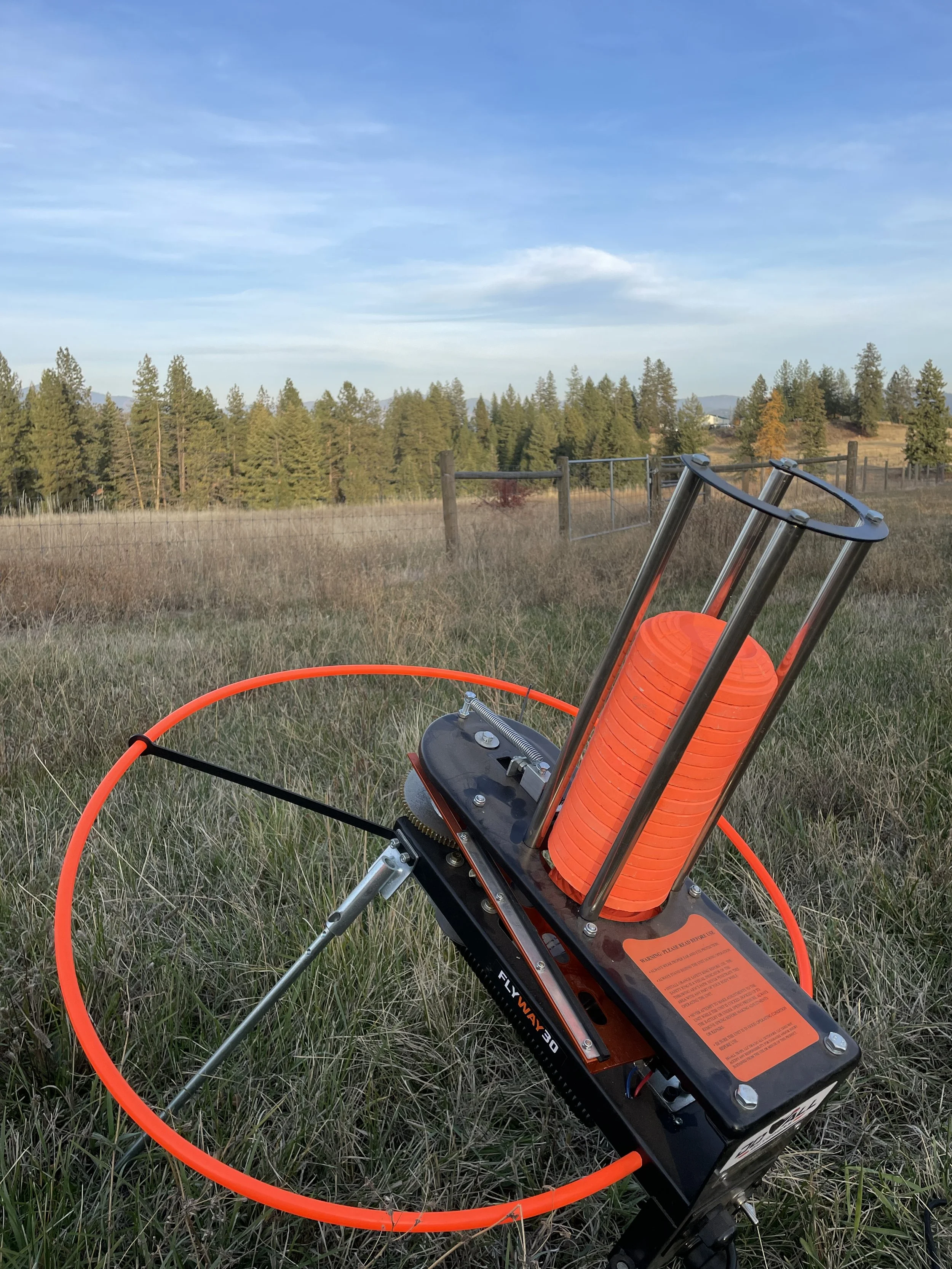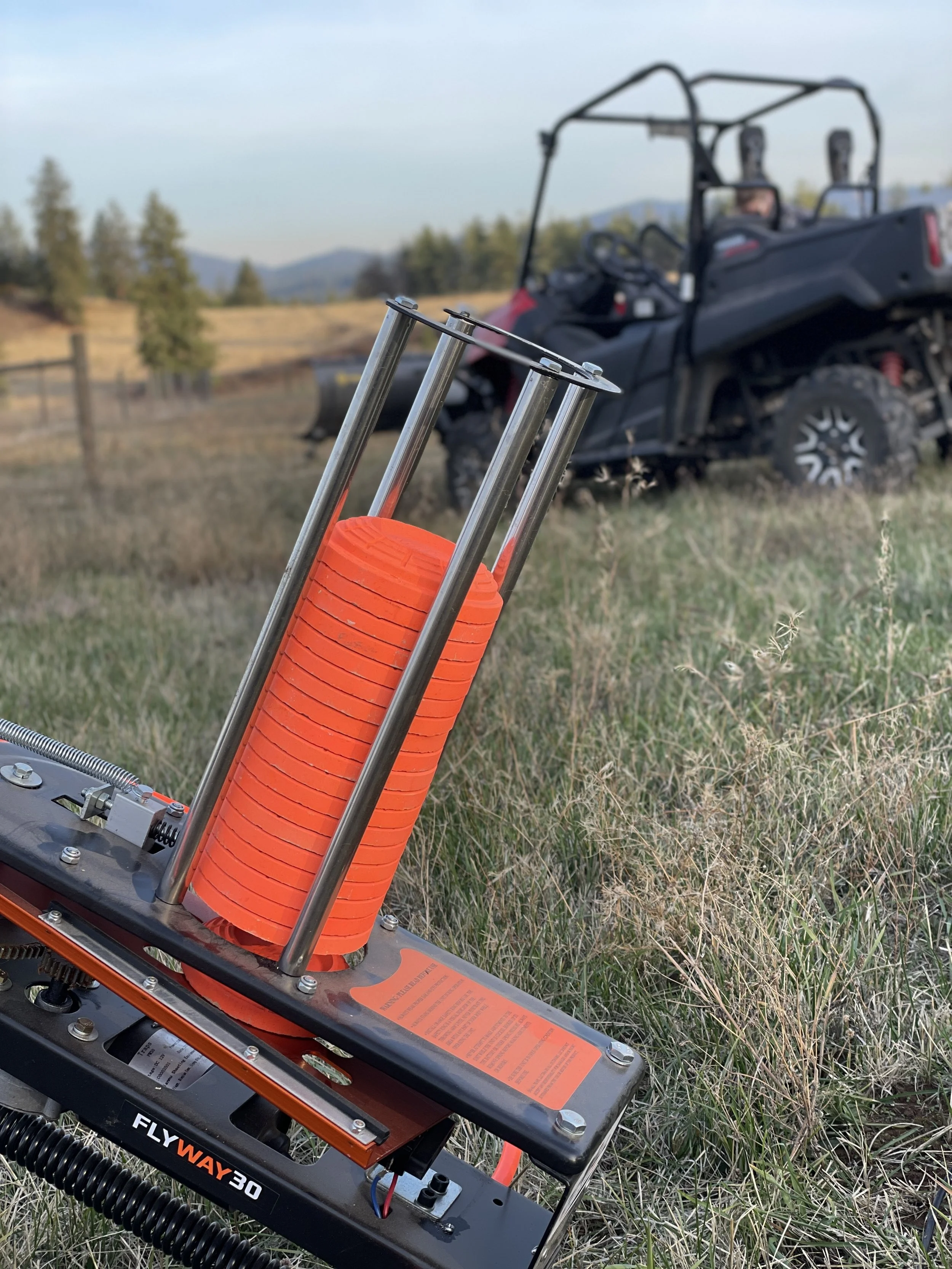 But the big activity today was Clay Day! We put an extra car battery in the back of Big Red, which powers the thrower. We have to say that this machine has served us very well, much better than our older model, which seemed to misfire and ruin a frustratingly large number of targets. This one is easy to load and use and provides a variety of reliable throws.