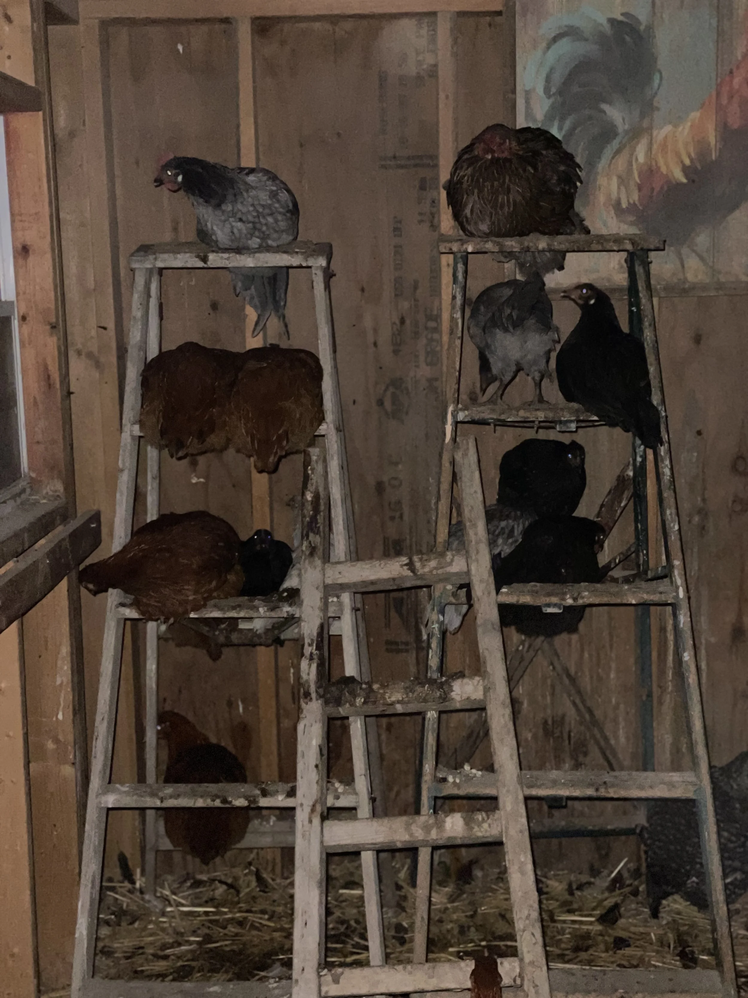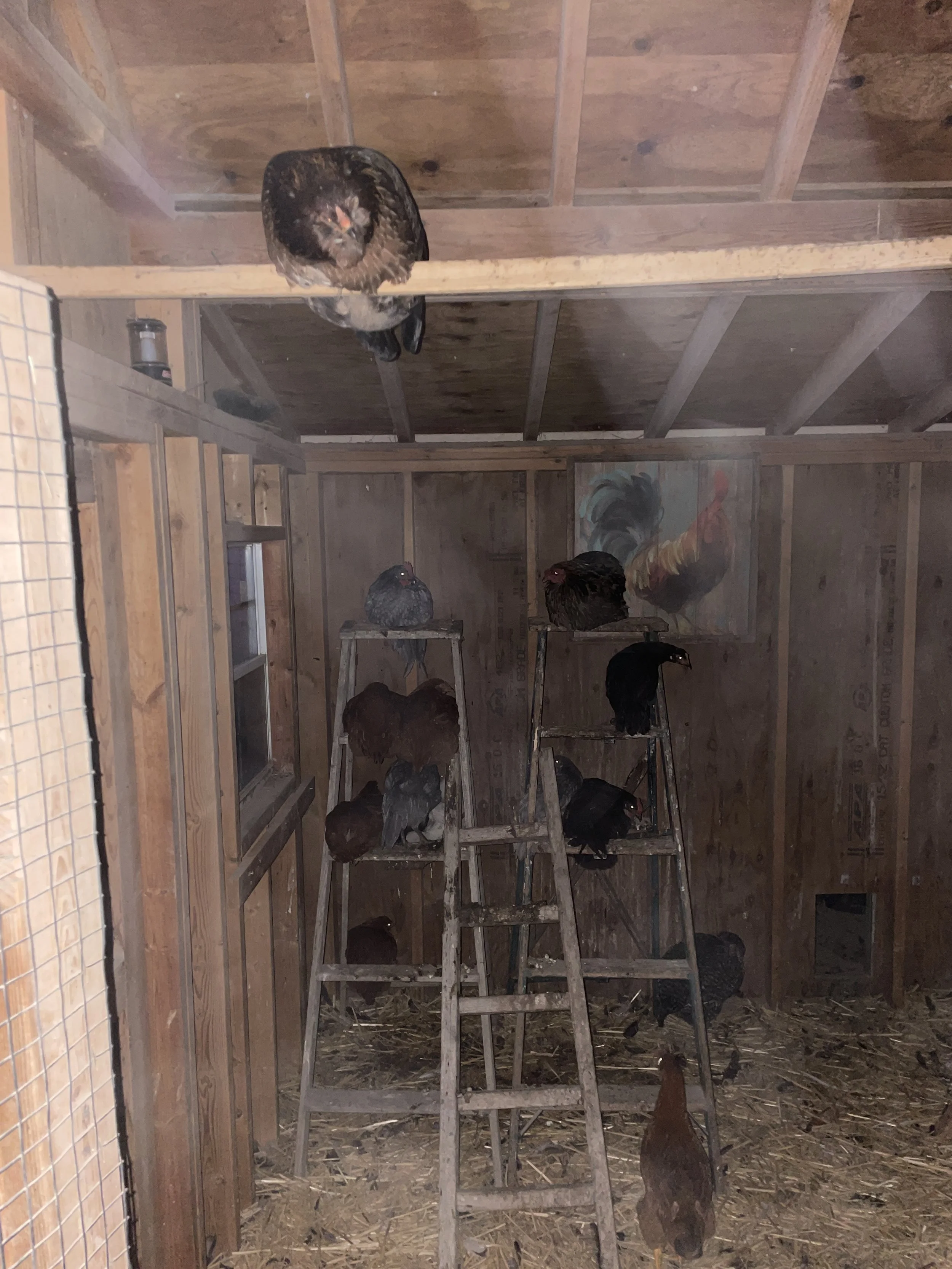 The babies still sleep all together on two old ladders I set up by the window in the coop. This despite the fact that there is tons of space available on the primary roosts. I wonder if any of them will ever make the move. I noticed the bird on the top right is NOT a baby!