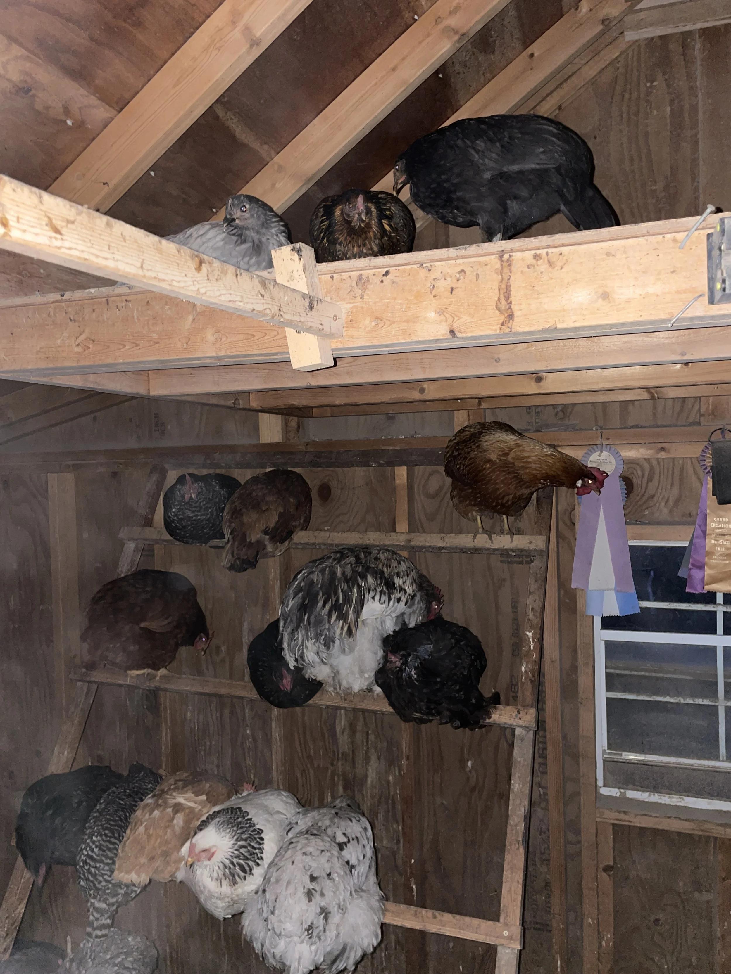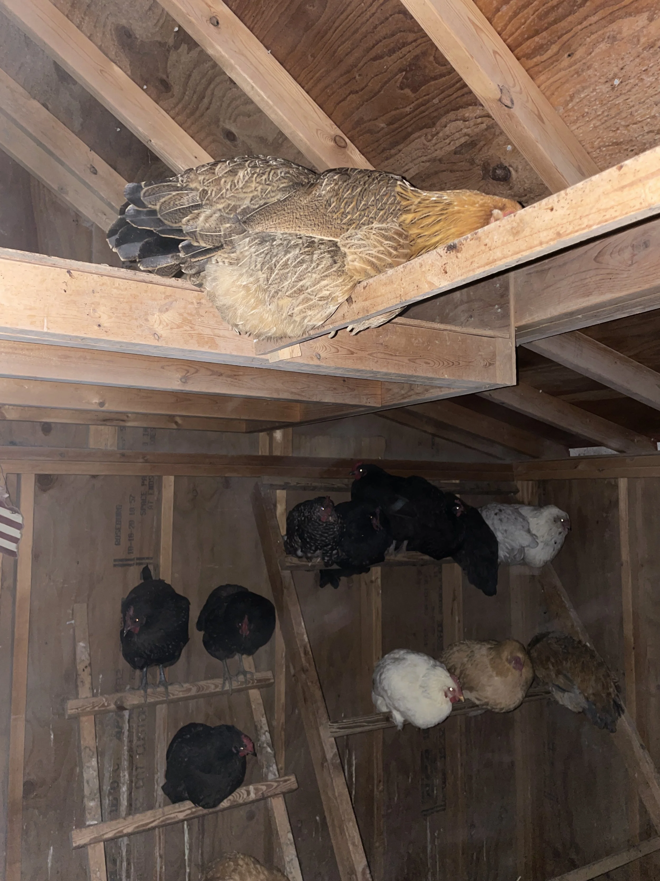 Sarge and his girls. Three to five girls like to sleep up high each night, either on the tall roosts that cross the middle of the building or in the loft, as shown here. Interestingly, the gray bird in the left-hand side of the loft is one of the babies!