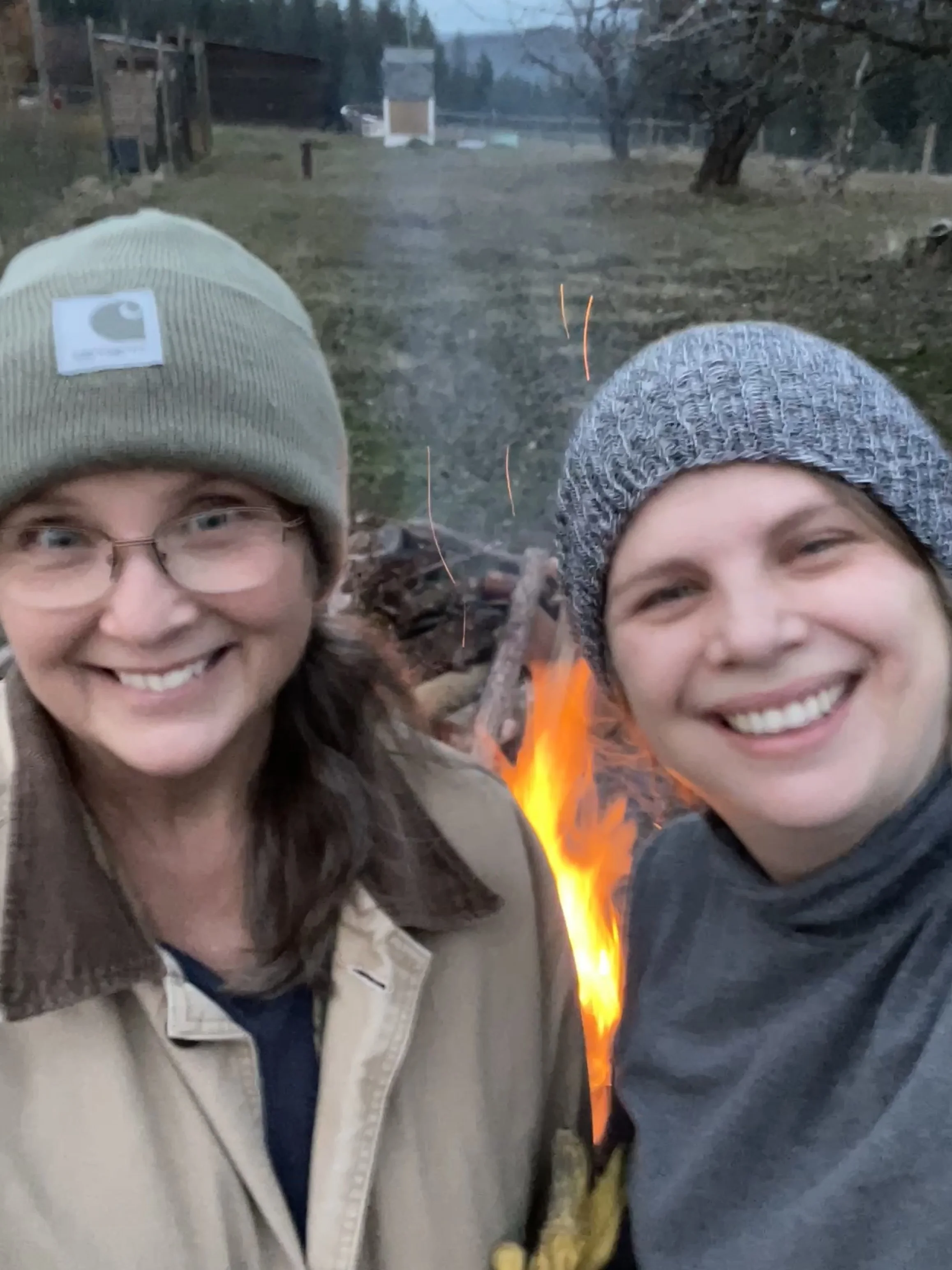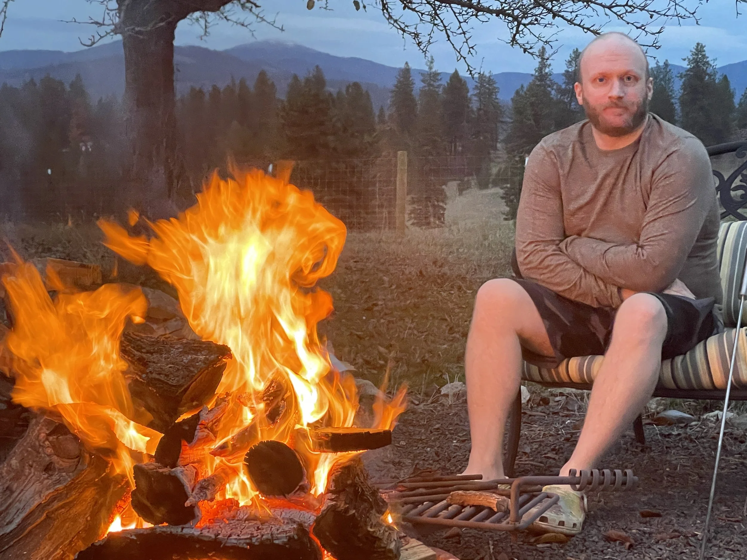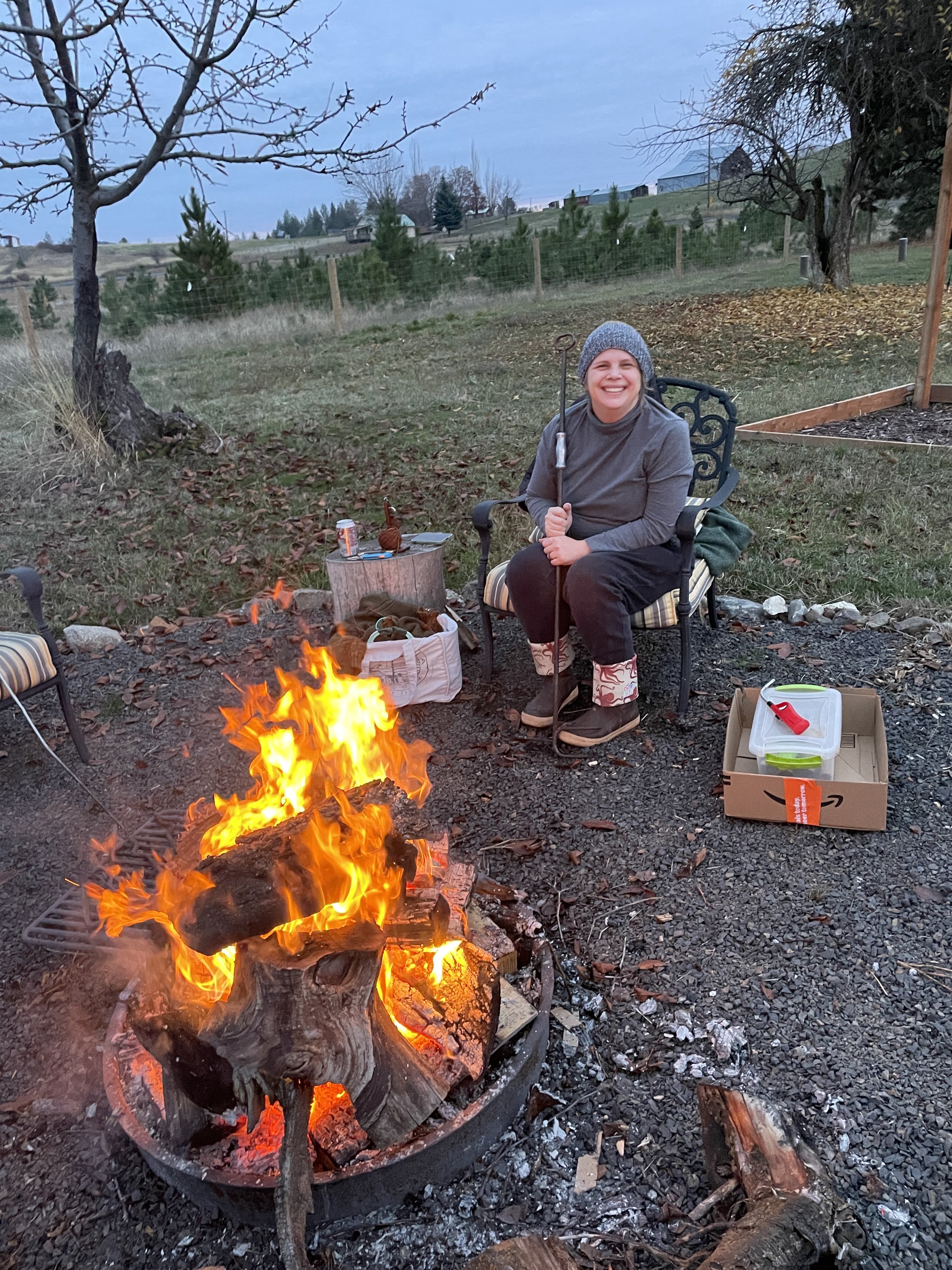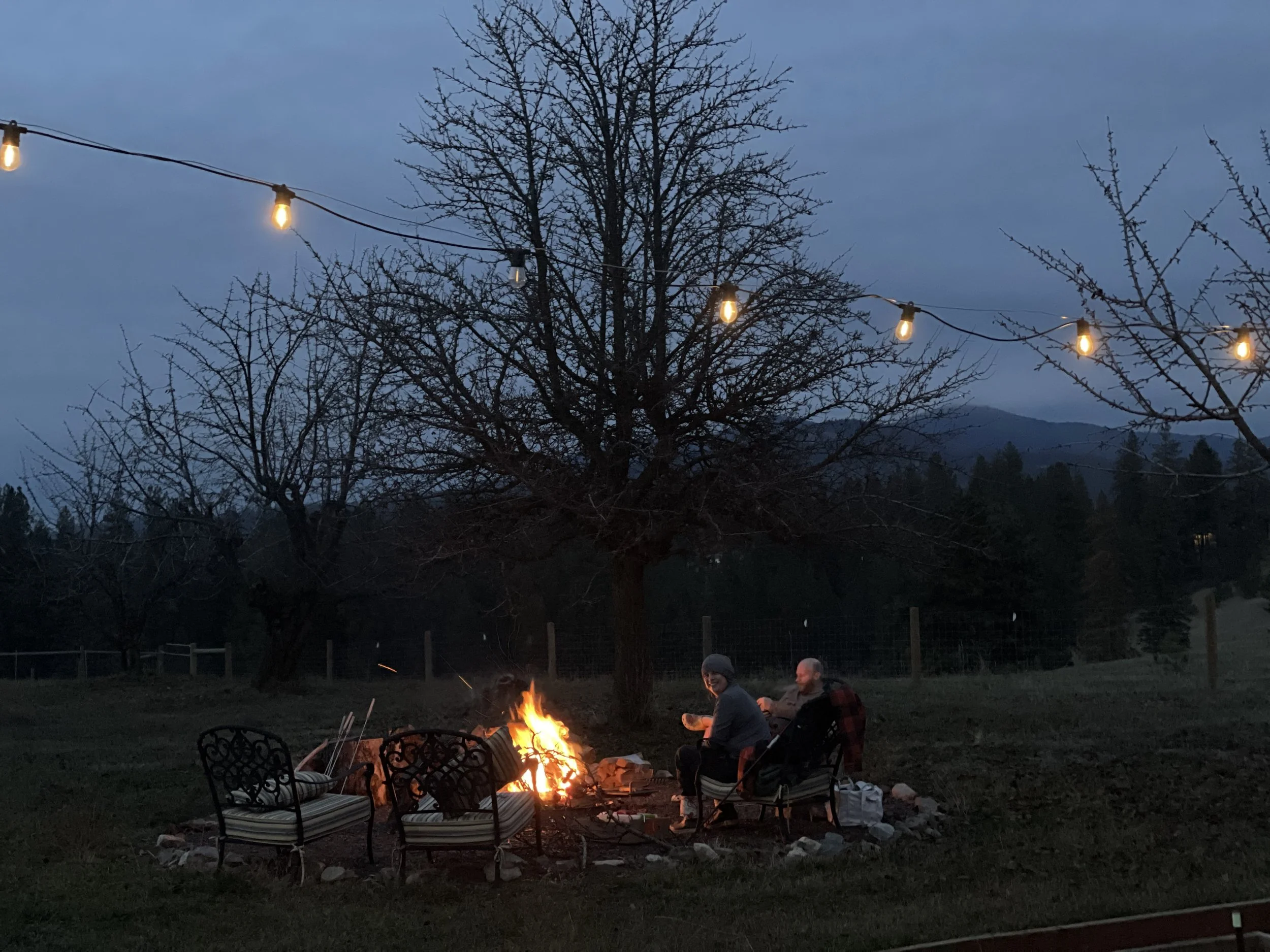 Fire up in the sky, and fire down in the firepit! Montana and Elijah put their fire-making skills to use to burn some of our miscellaneous trimmings. Nice evening for both!