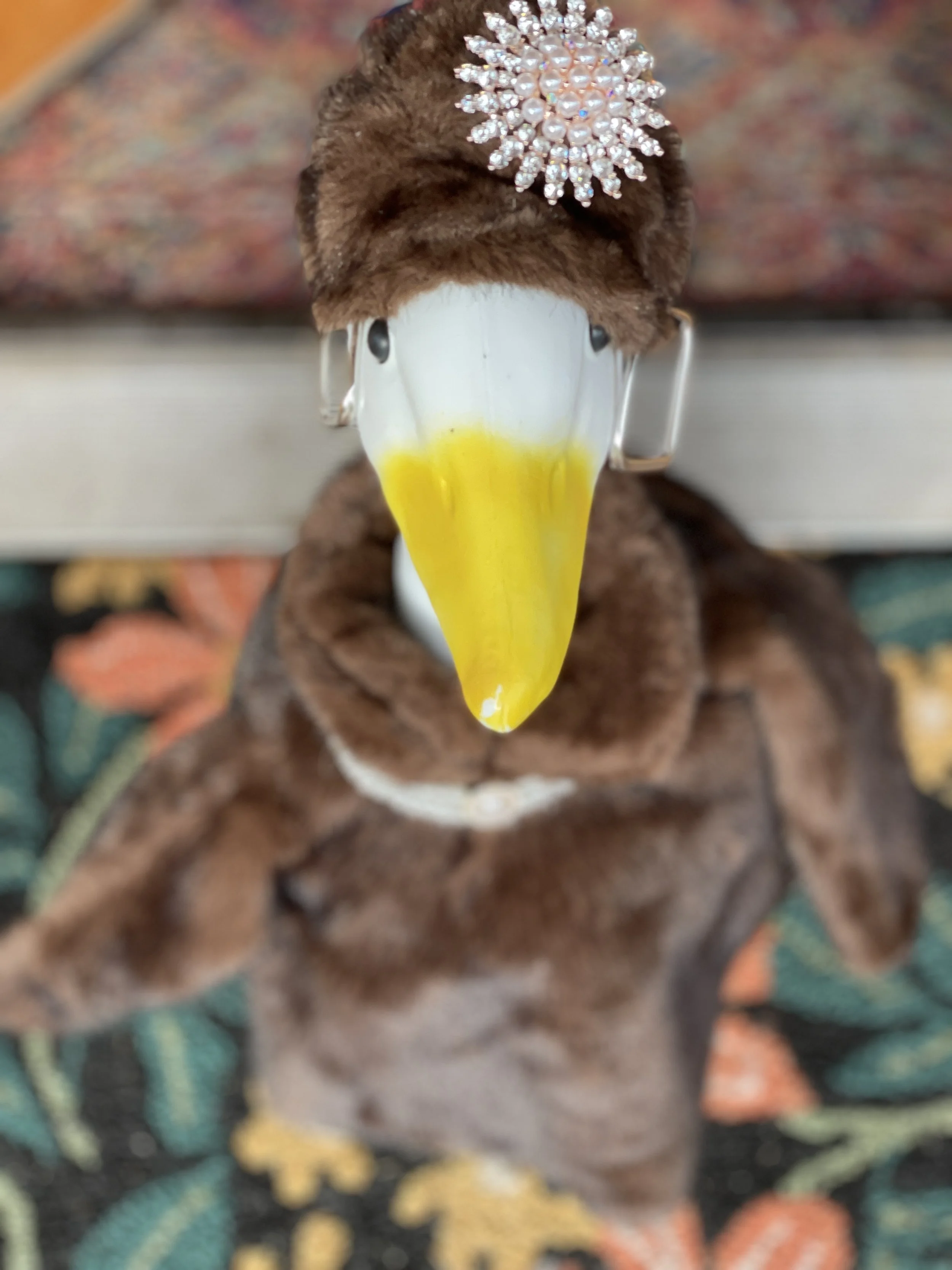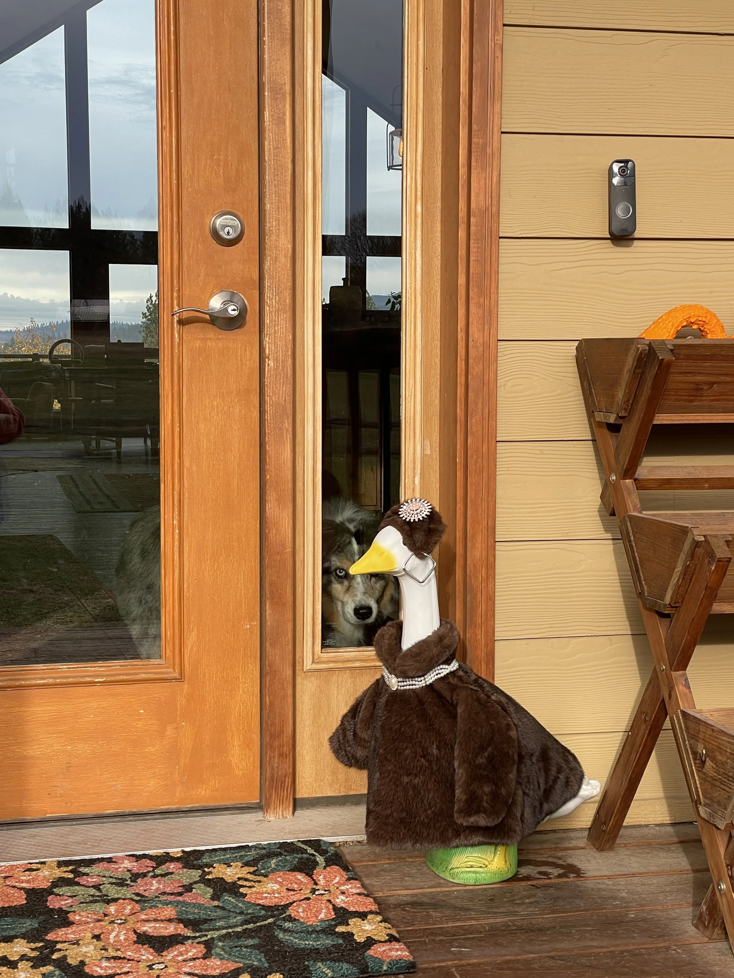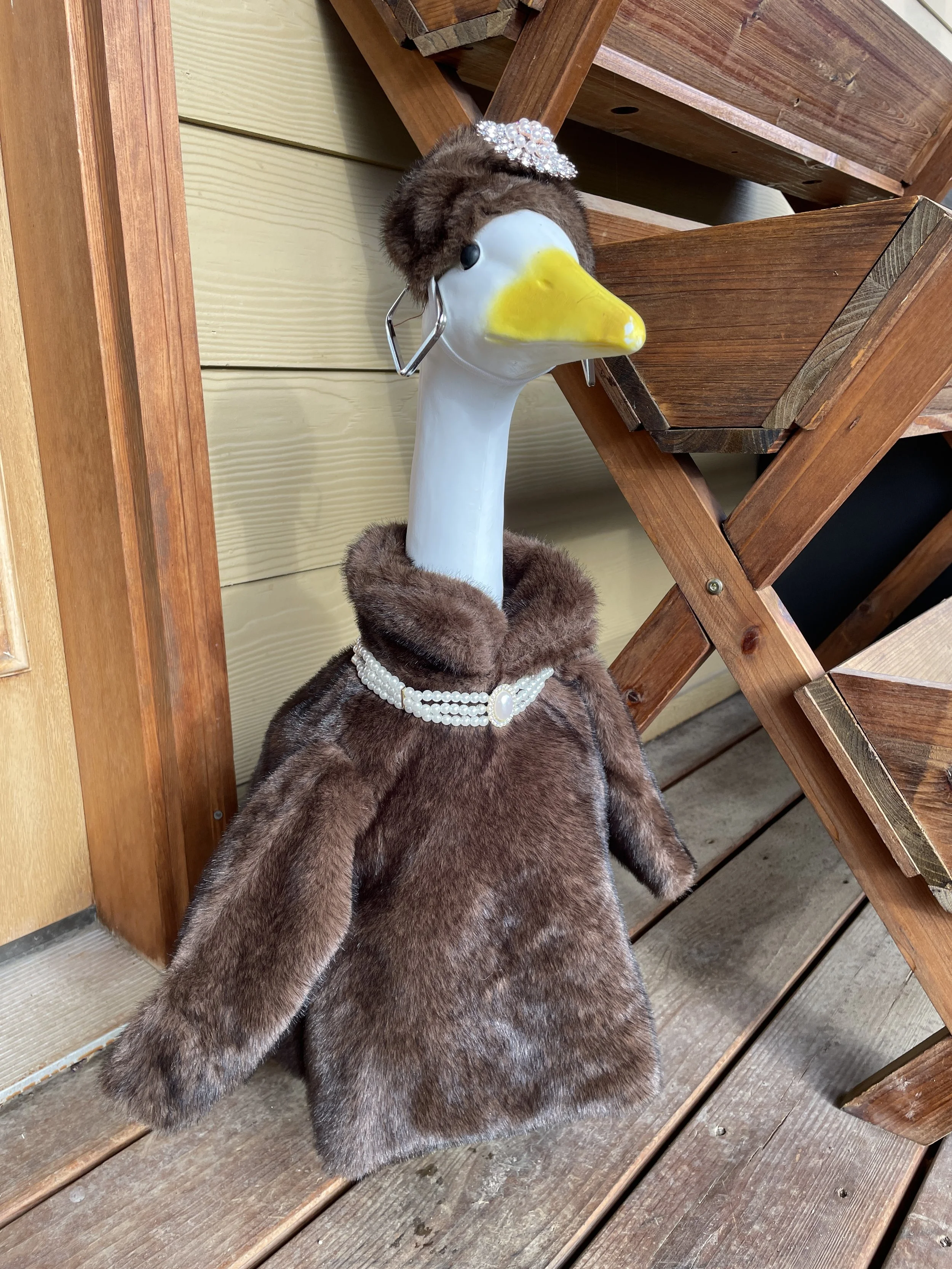Today Goosie got a glow-up, including a good scrubbing, a new outfit (fur coat/hat with jewelry!), and a new weatherproof spot by the front door.