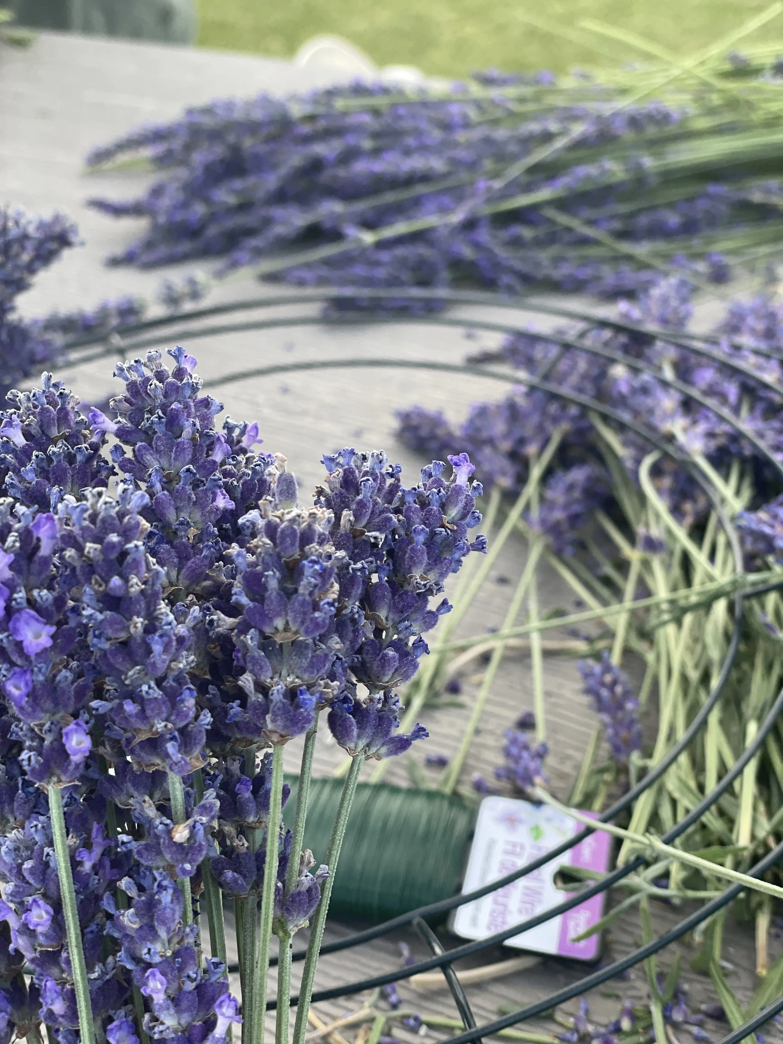 Montana went over there tonight for a little wreath making workshop. By the end of the event the wind had picked up something fierce, but the end results are beautiful. And the smell - if you are ever feeling stressed I suggest you sit at a table in the middle of acres of lavender plants handling lavender sprigs for a few hours. What a smell!
