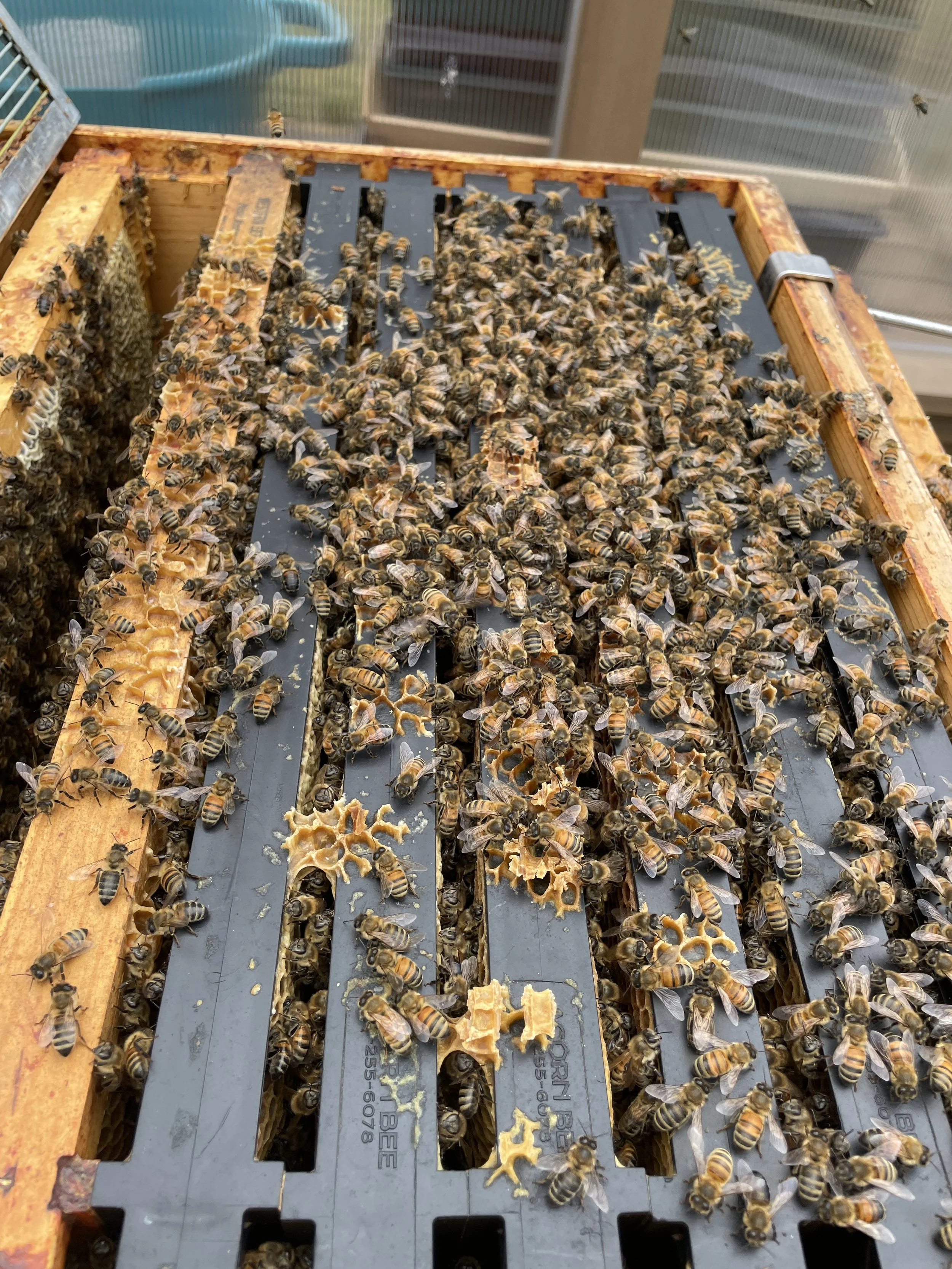 Some of the frames are wood, and some are plastic. Every once in awhile we get a hive that HATES the plastic frames, but this one doesn’t seem to care. I had some white plastic frames at one point, and I swear every hive hated them all.