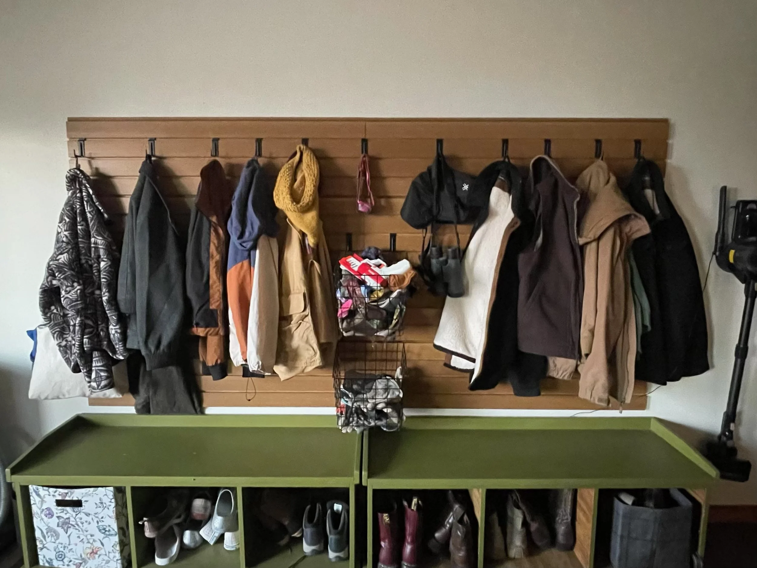 Now this is the absolute coolest thing Montana has come up with. She has been envisioning a slatted wall solution (like is used in retail stores) for their coat and boot area next to the wood-burning stove. She finally found a beautiful and affordable system that they just installed. You can use any kind of hooks, baskets, shelves, etc. anywhere you want. Steve and I loved it so much and were so impressed with the quality and ease of installation that we immediately ordered some materials to redo a wall of our master closet. And Montana and Elijah are adding more along the top of this initial set up, too. Briliant!