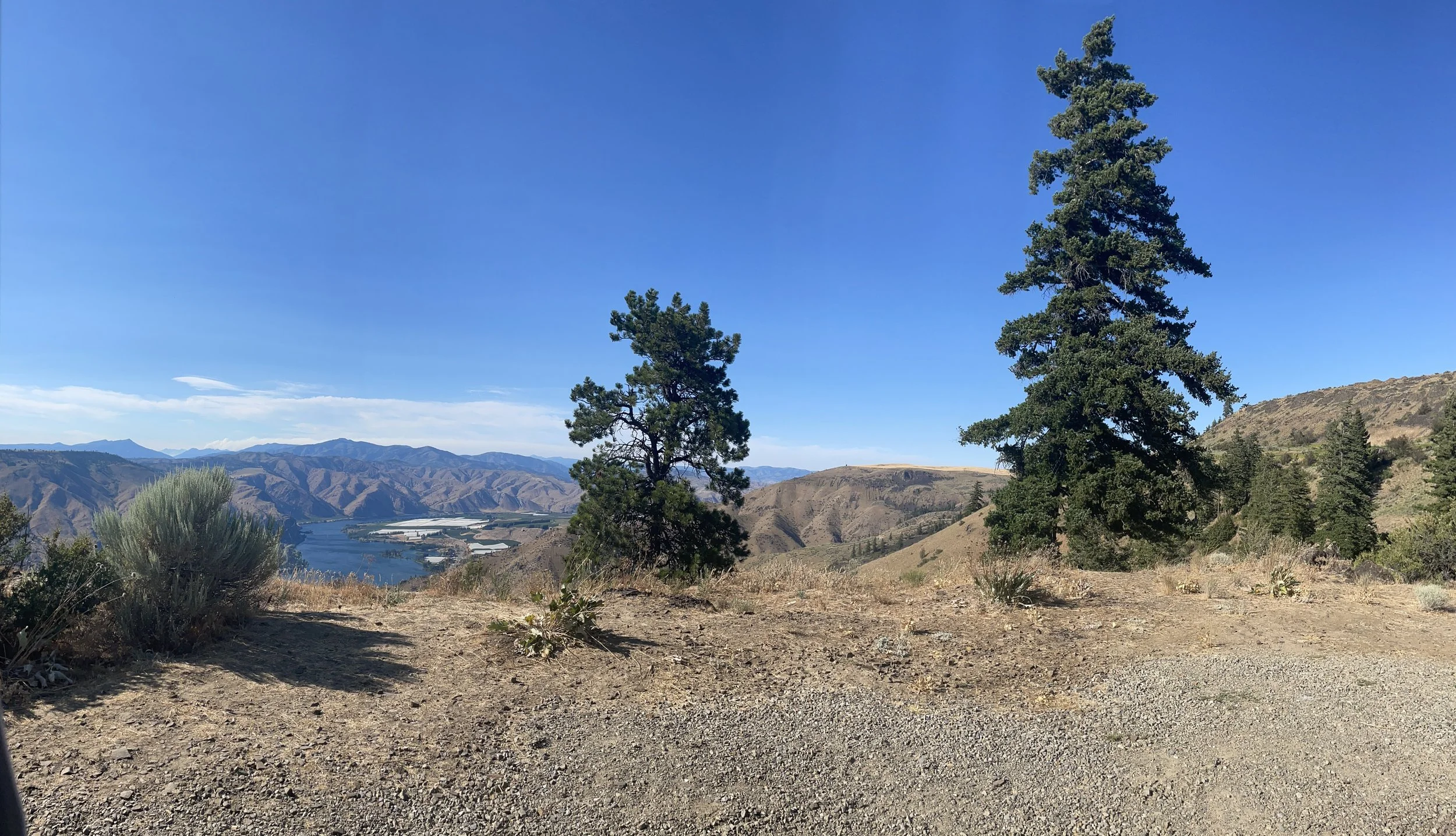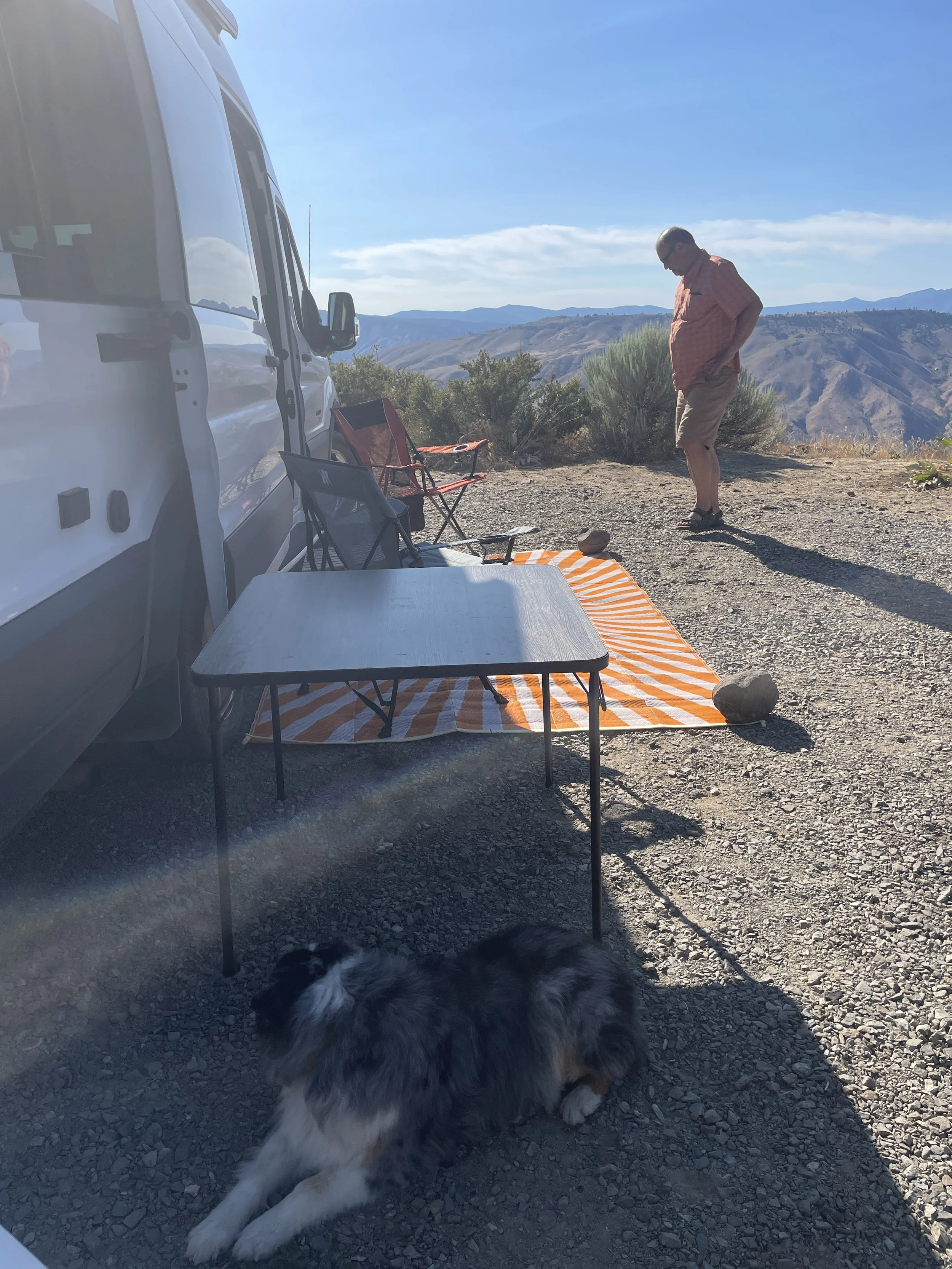 But when you make it here, it’s just like a little mountaintop all to ourselves. We are way up on a hillside overlooking the mighty Columbia River. We could not decide which direction to set up because all directions are gorgeous. The winds today (the entire drive and also up here) are fierce! Glad we are not tent camping.