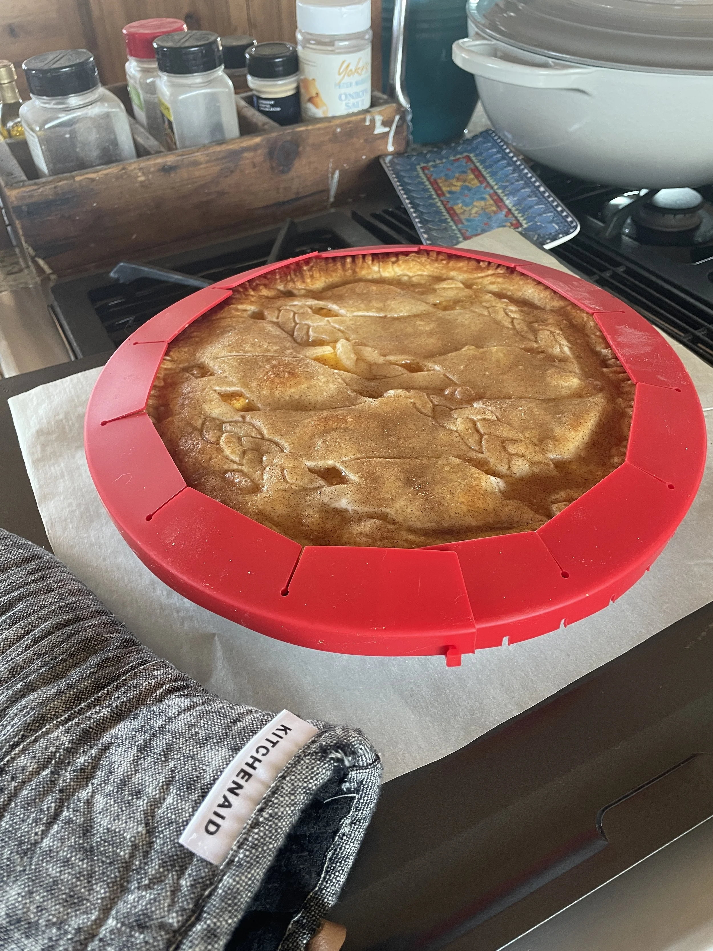 The cooking on this pie is a 4-step process: You start with 10 minutes at 450, then drop the temp to 250 for another 10. Then you add the crust cover (so the crust won’t burn, this one is silicone, and I like it because its design allows it to expand/shrink for different size pie pans) and cook for another 20 minutes. Finally, you turn off the oven, but leave the pie inside, for another 10.