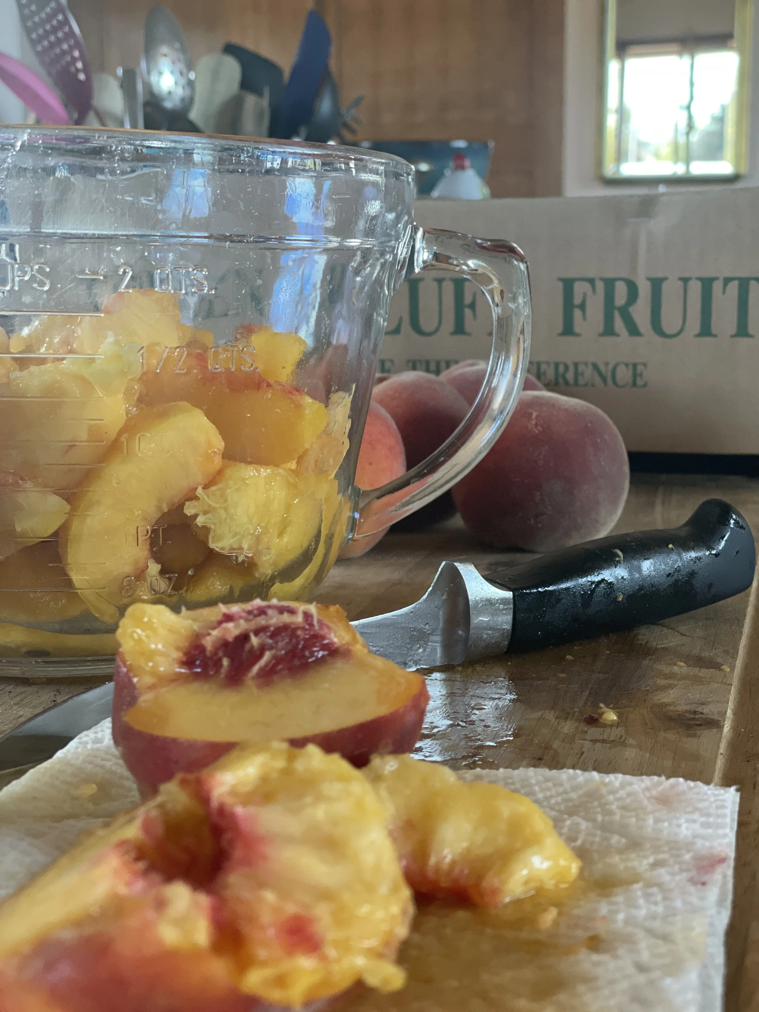 So much juiciness! These are red haven peaches, with firm flesh and a sweet-tart flavor. The skins peeled off really easily (without blanching.) They are also freestone, which means the pits come out fairly easily. But cutting them up is still a juicy mess! I probably should have asked ChatGPT for some slicing tips.