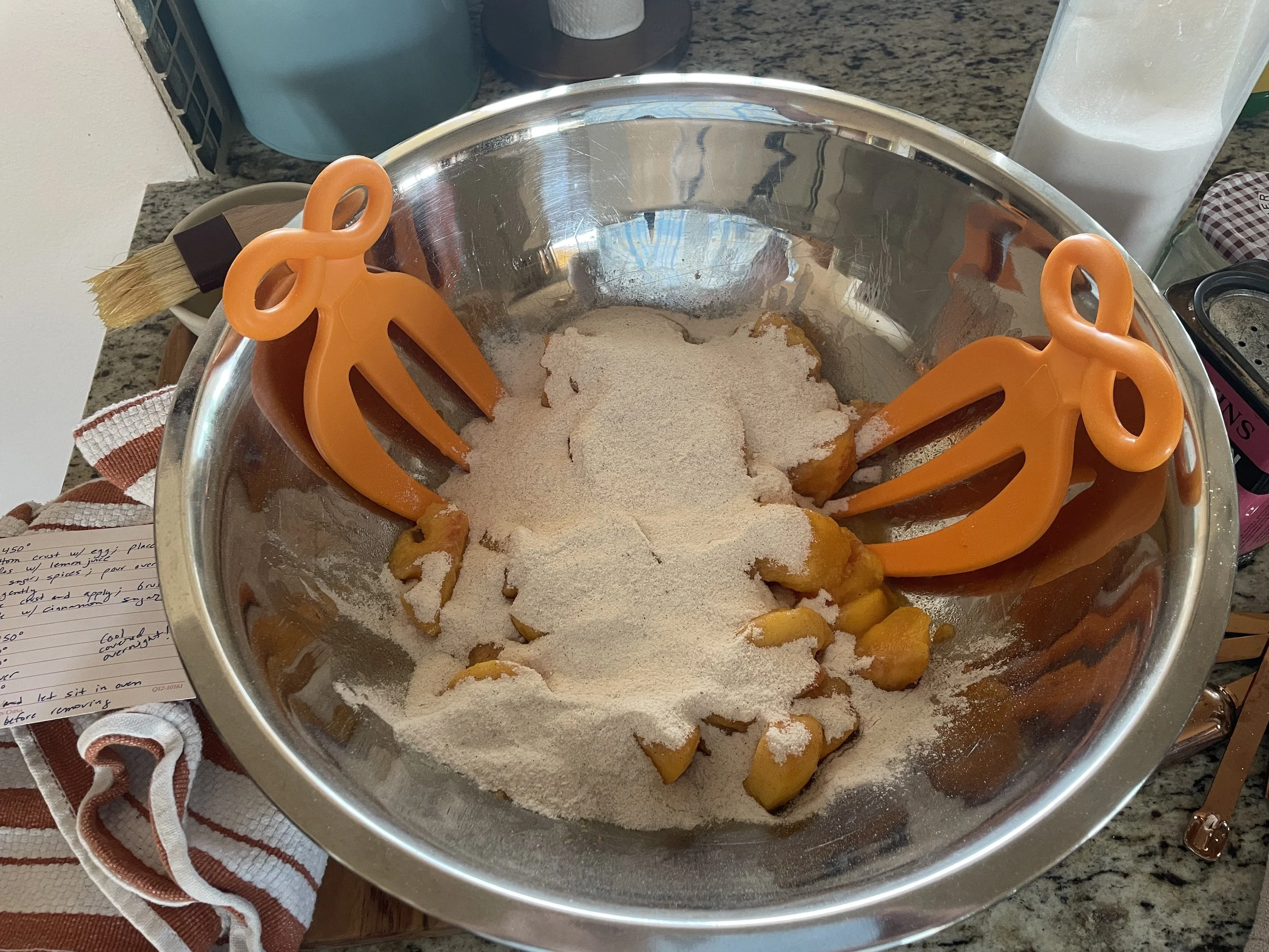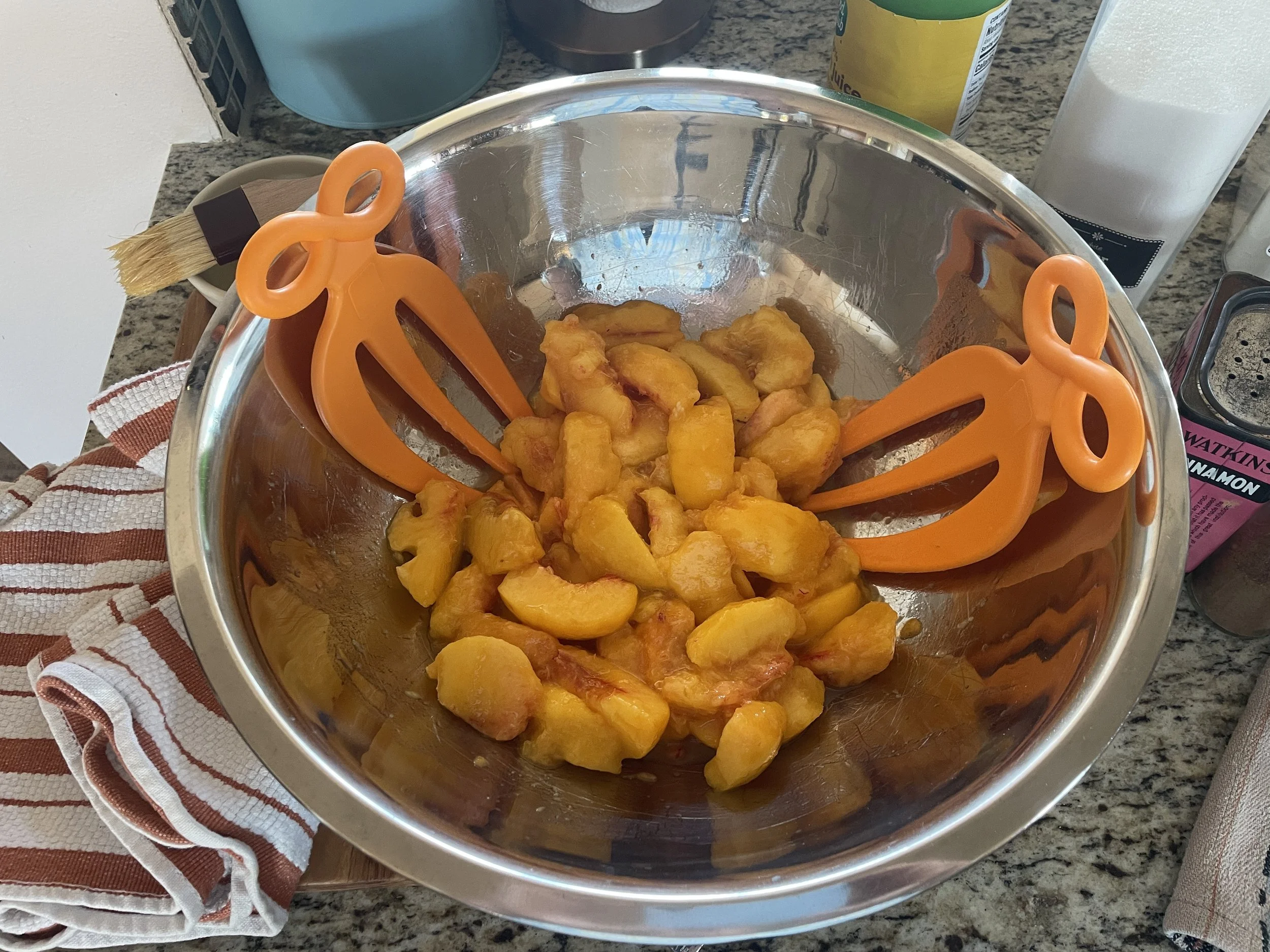 …and toss the dry ingredients with the peaches. I love these salad tongs that Mike & Leslie bought us about 25 years ago - they come in so handy for so many things!