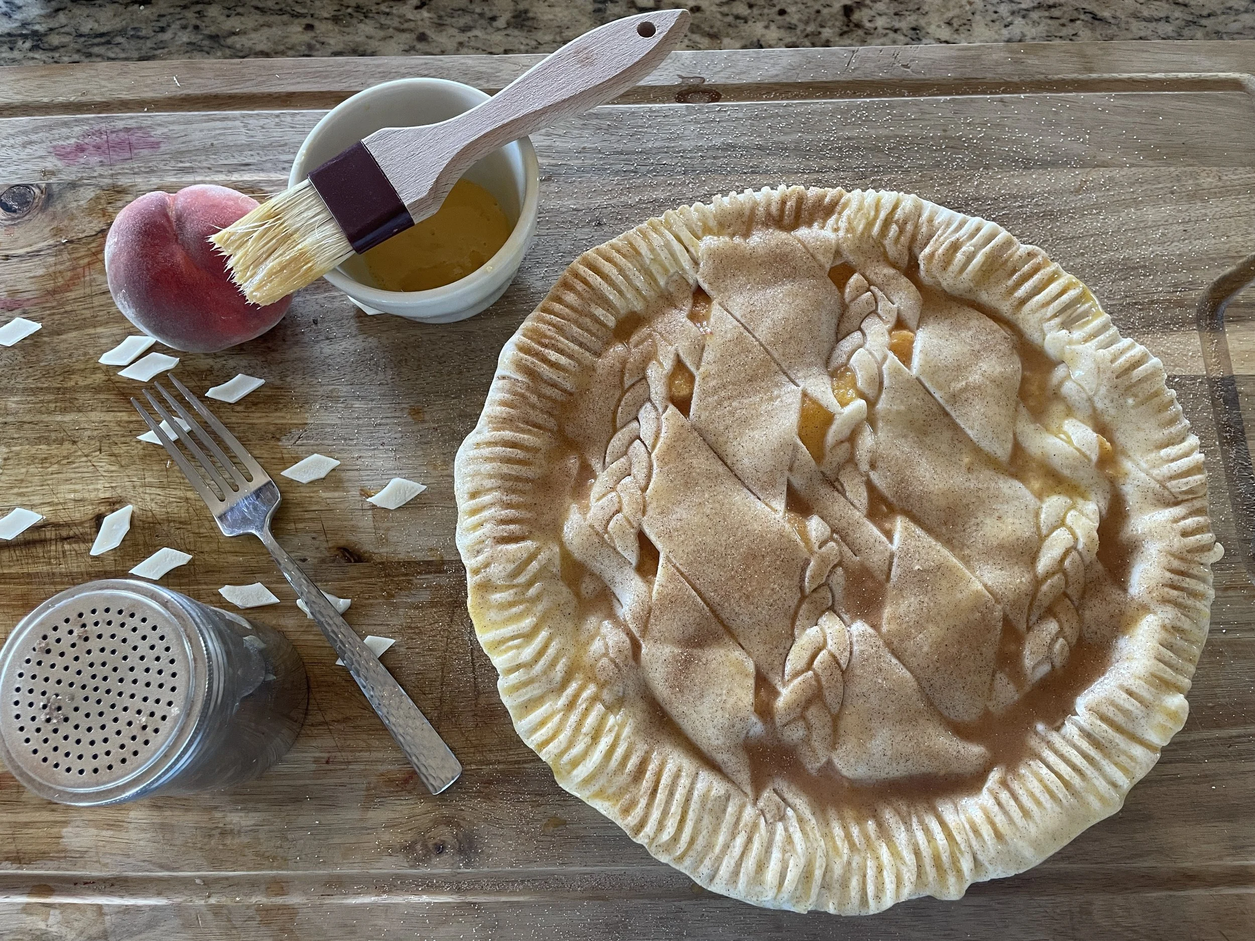 Prepare the bottom crust, brush with some egg wash, and toss in the peach mixture.