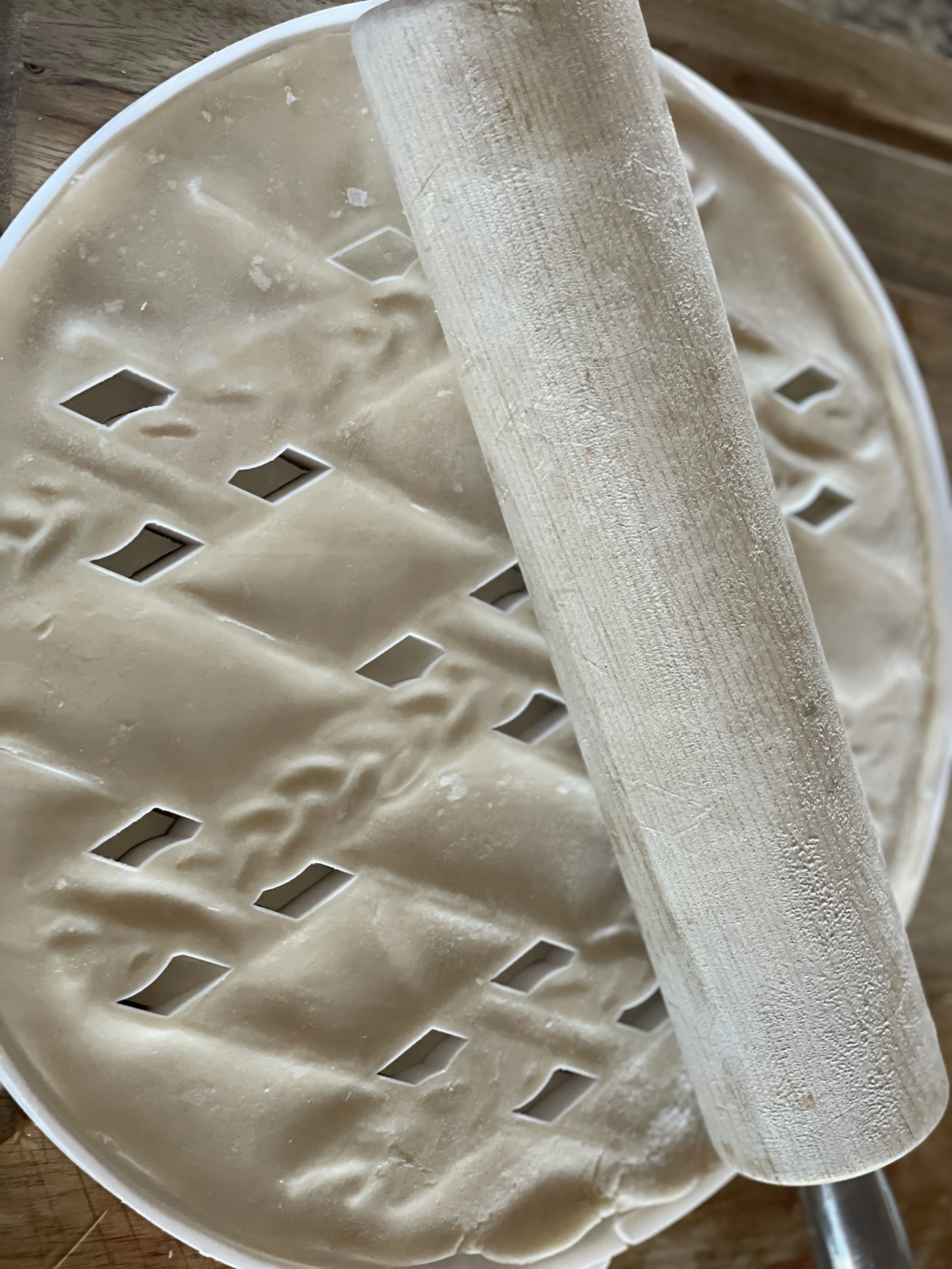 Here is my favorite “life hack”, courtesy of Williams-Sonoma. The form has two pieces, a base and an insert. You roll your dough over the top, and it cuts out and impresses your design.