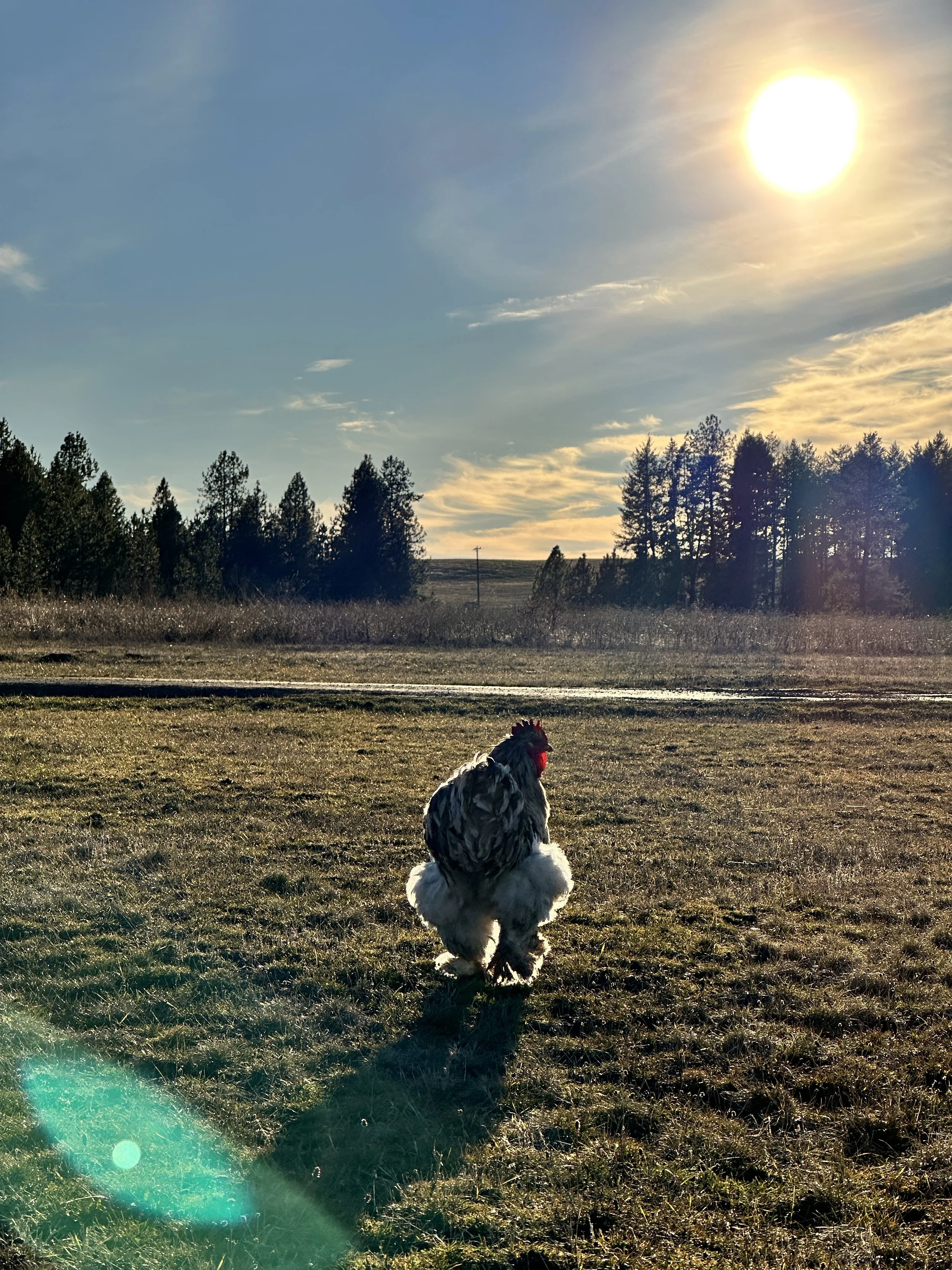 We have the sweetest, fluffy, gray and white, feather-footed Cochin rooster called Sarge. Sarge is such a good boy. He chats it up with the ladies and always stays super close to (or typically in) the run.