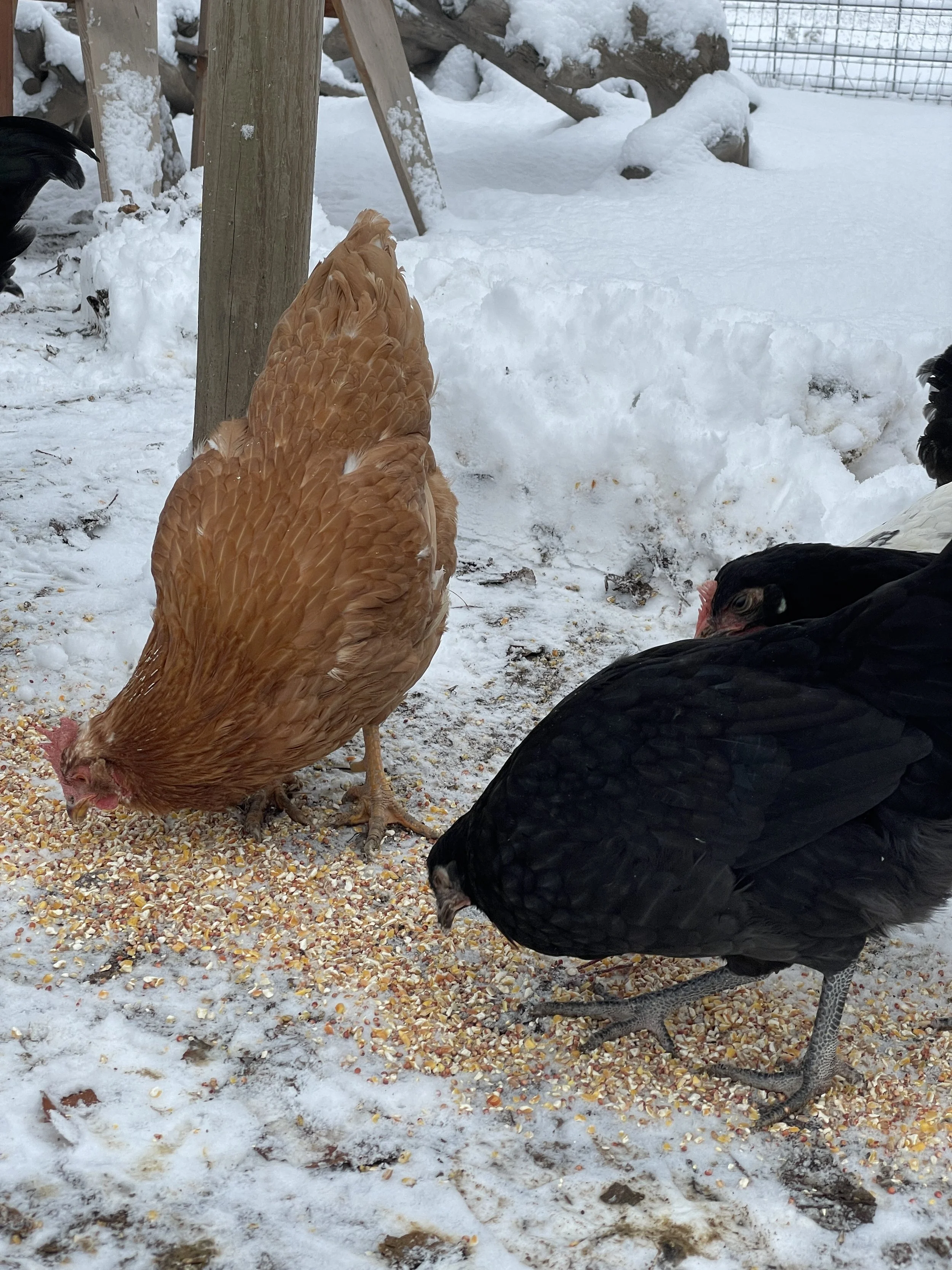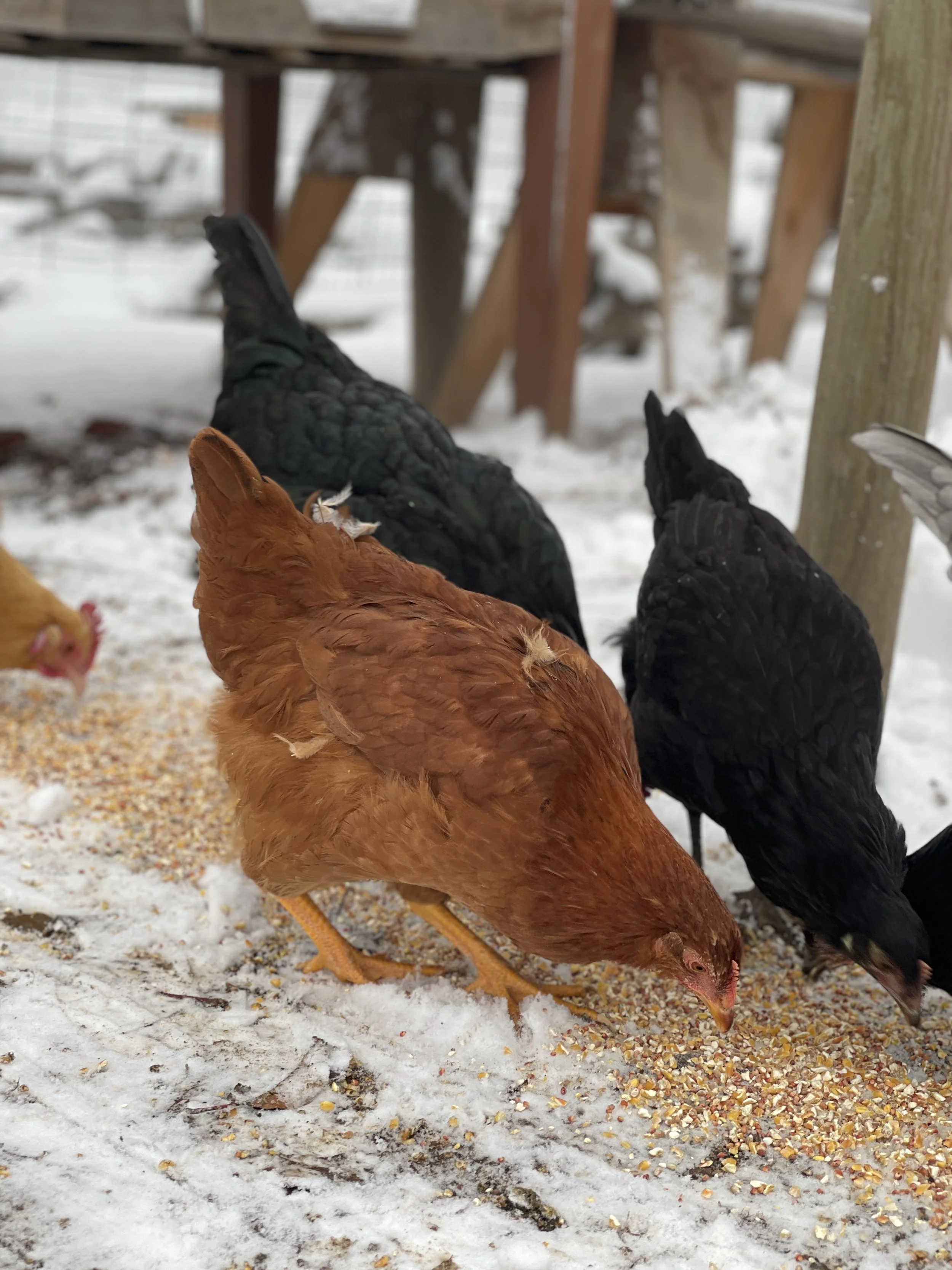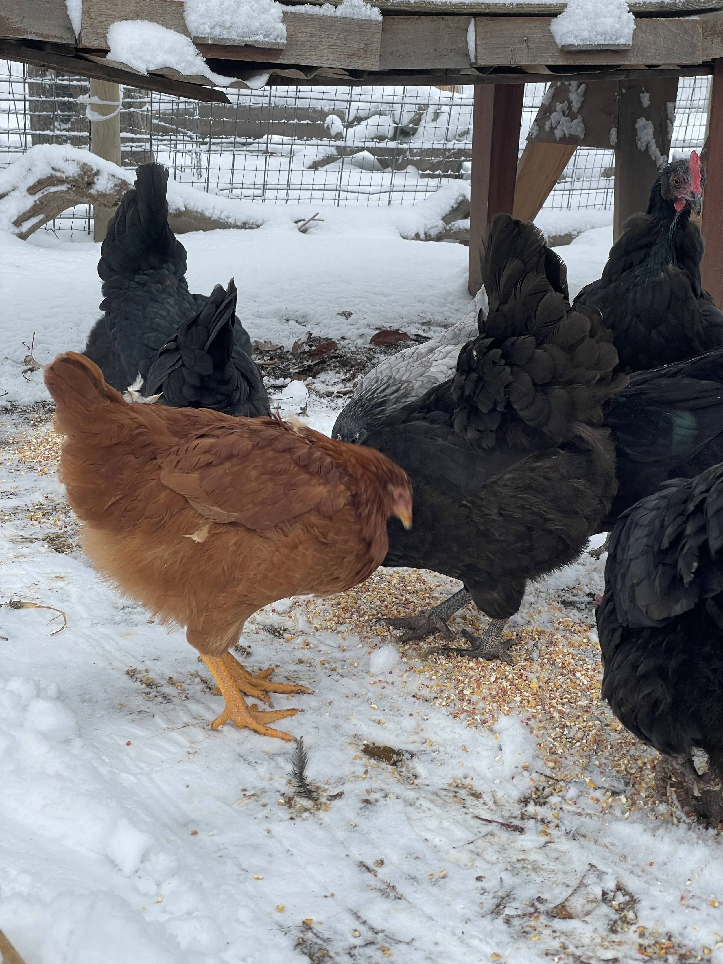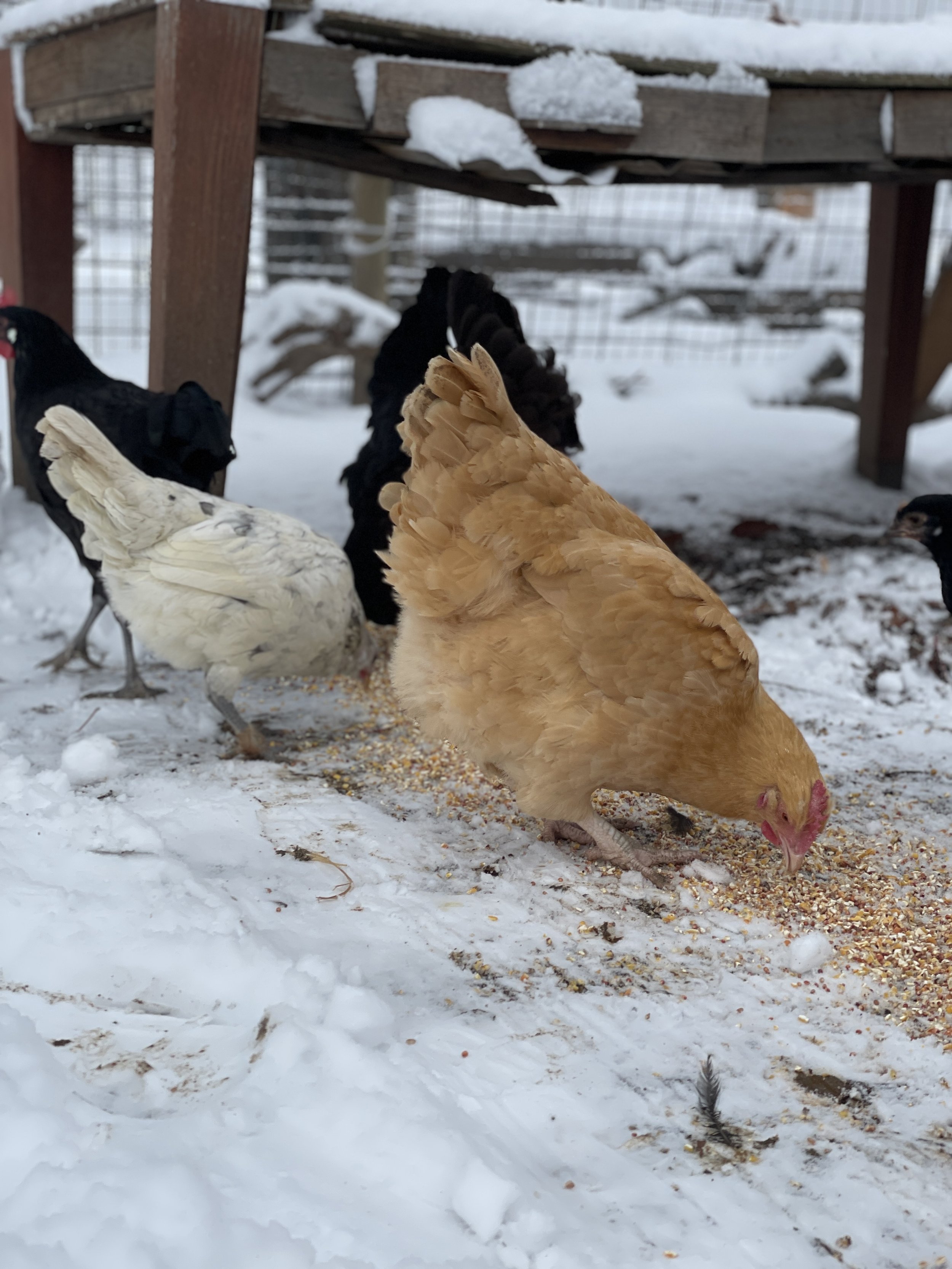 One of the oldest girls tentatively checking out the snow from the safety of the coop front door.