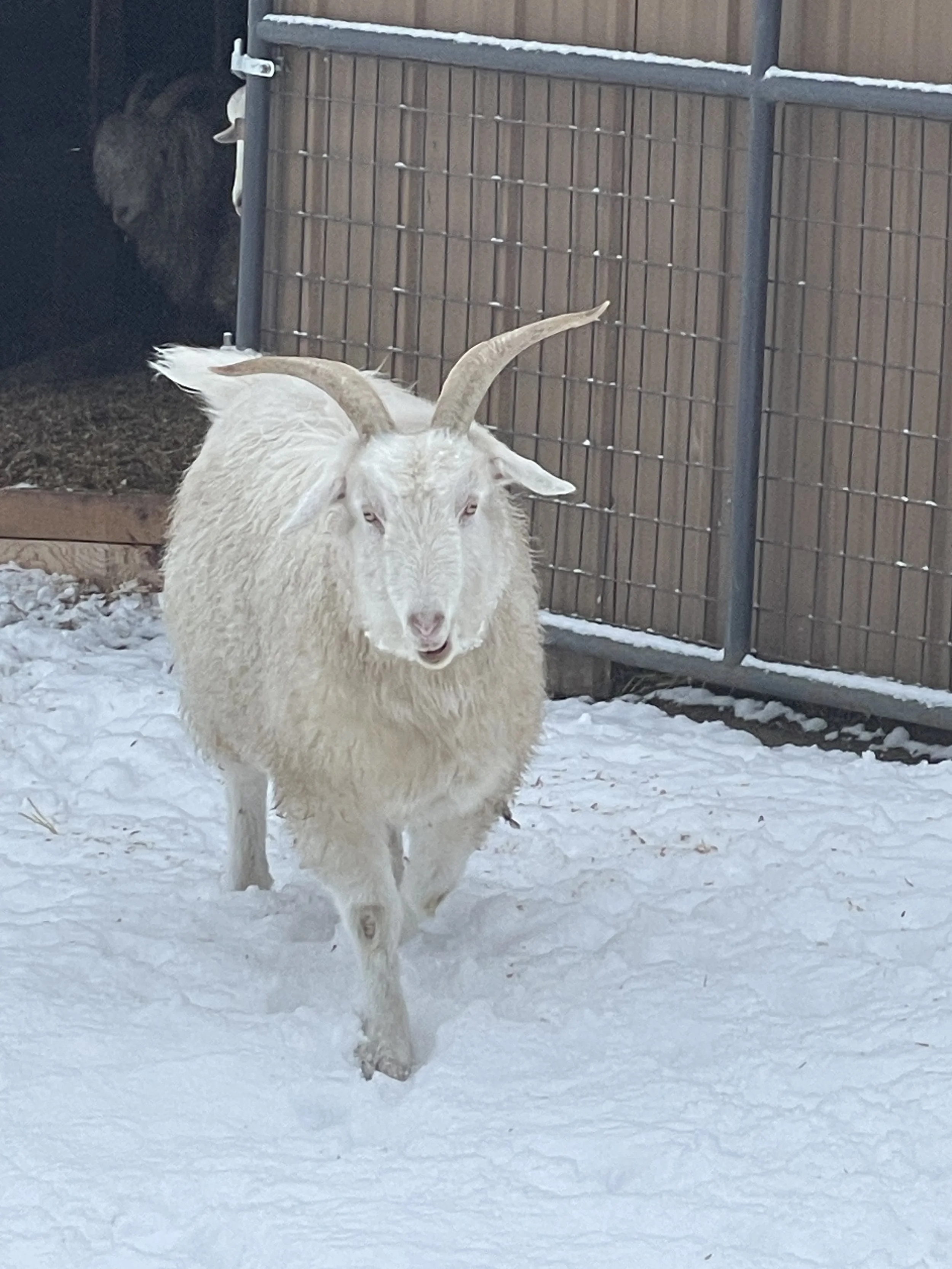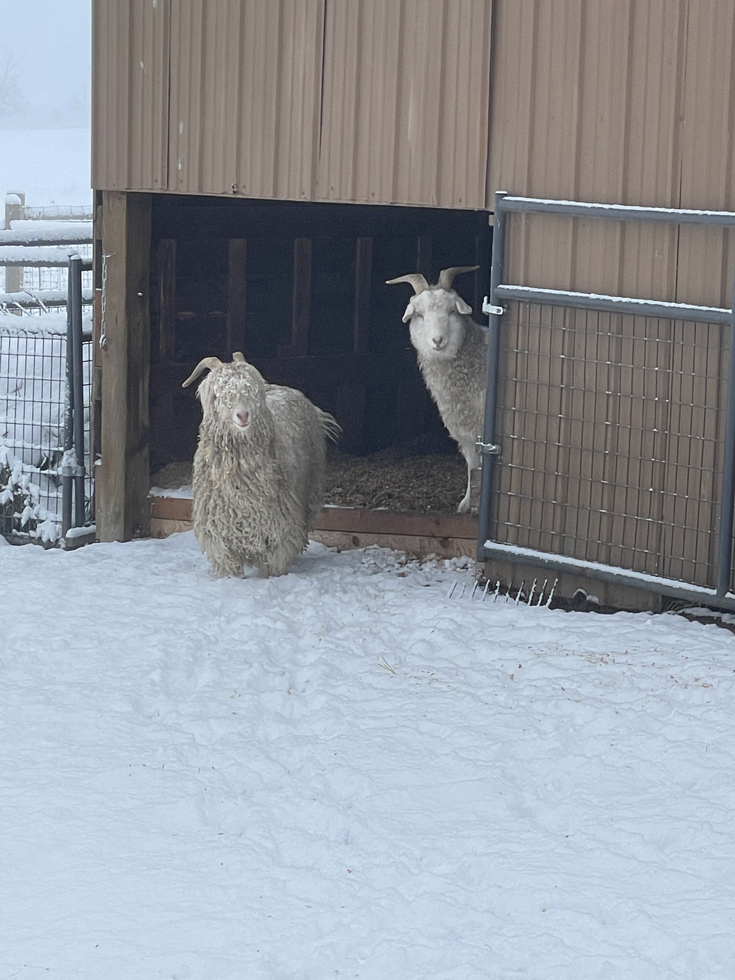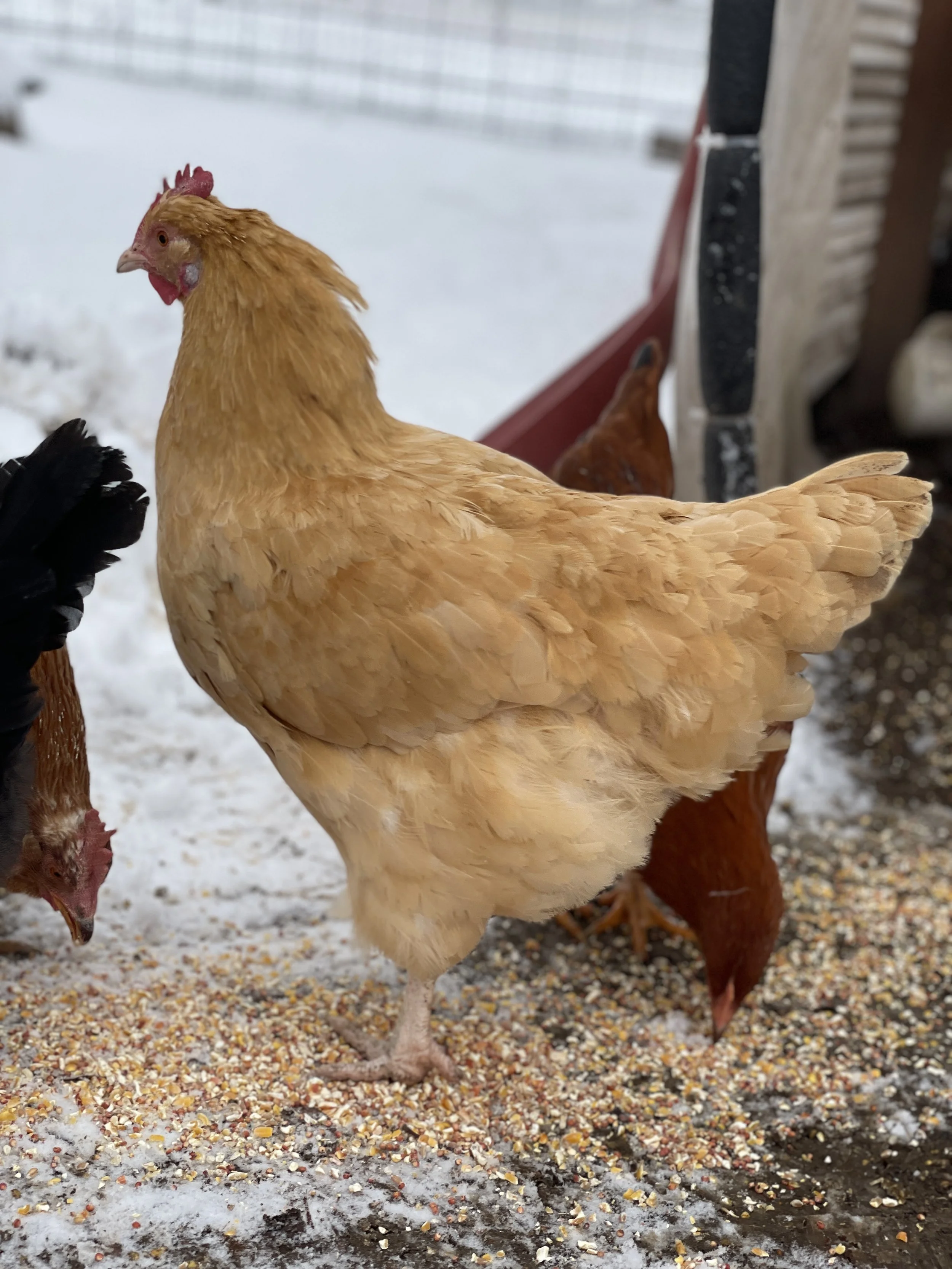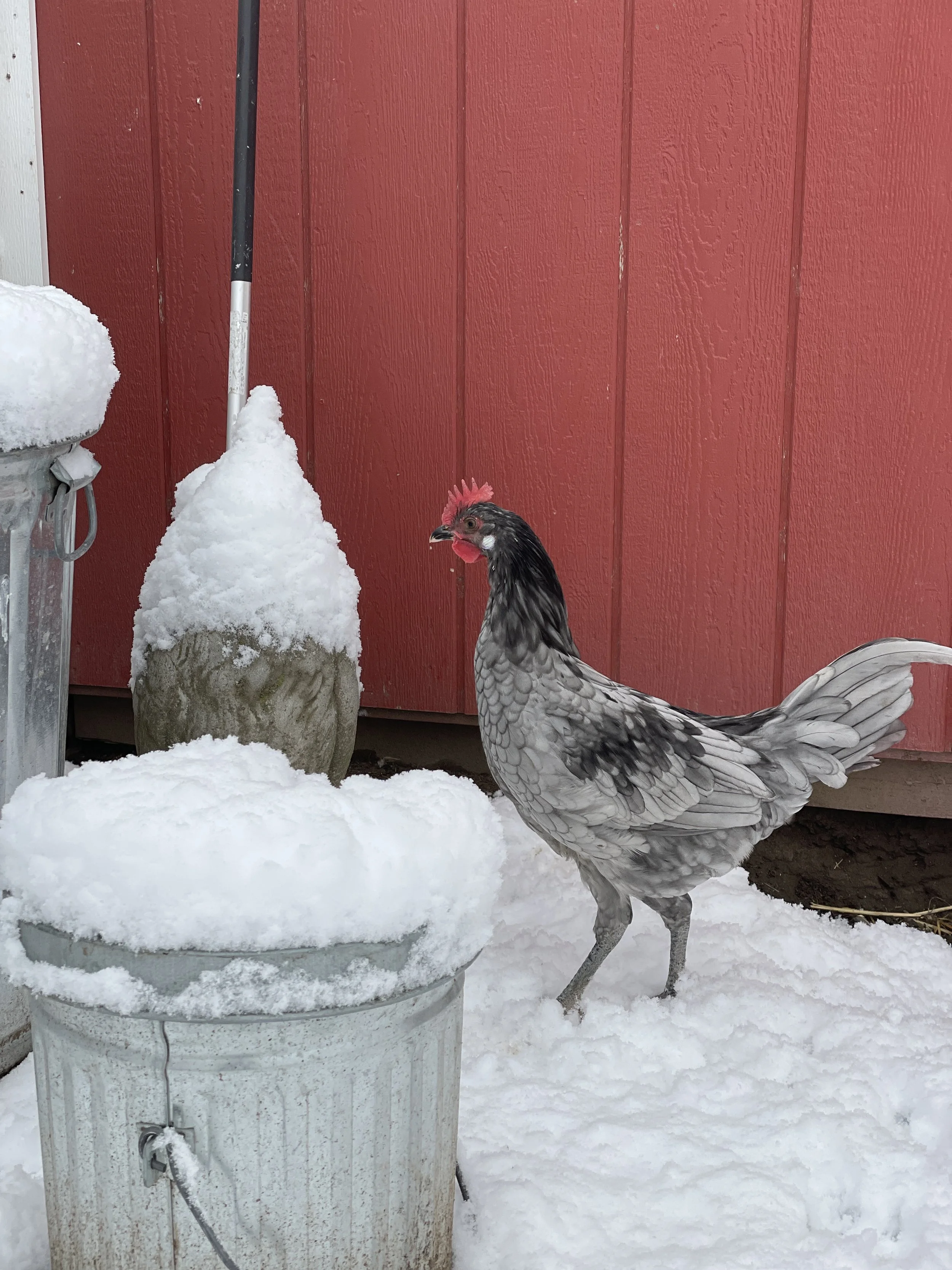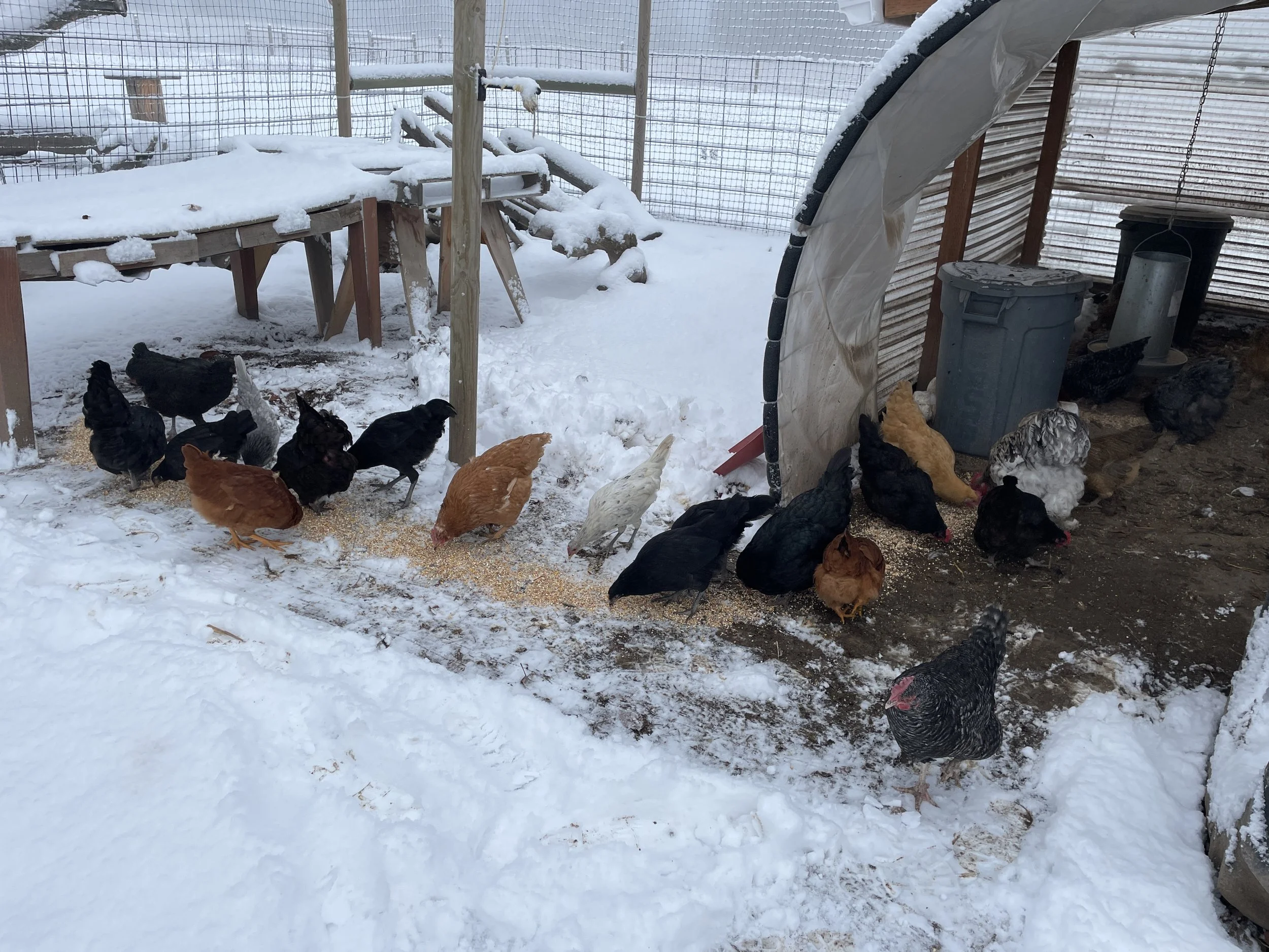 One of the oldest girls tentatively checking out the snow from the safety of the coop front door.