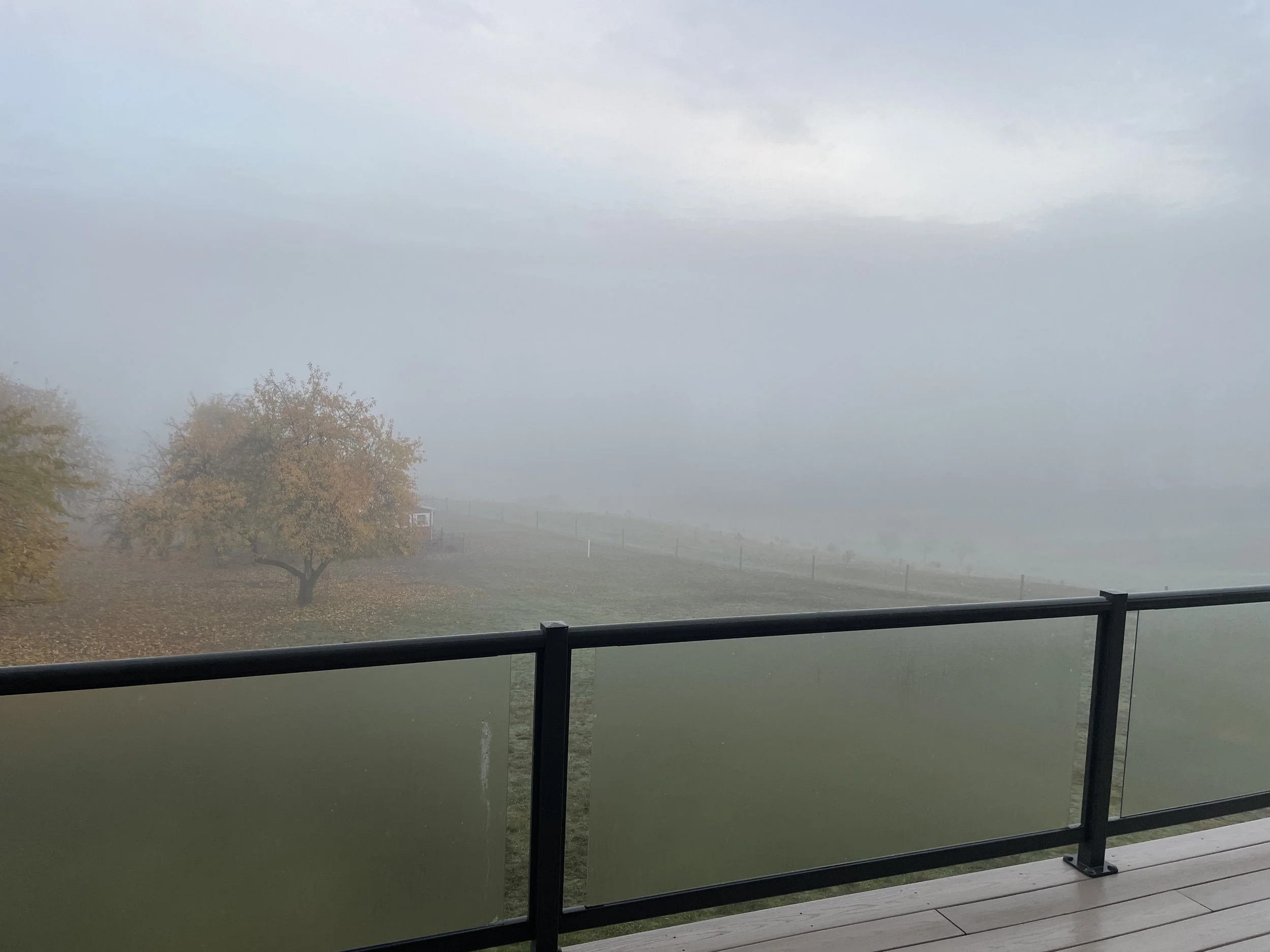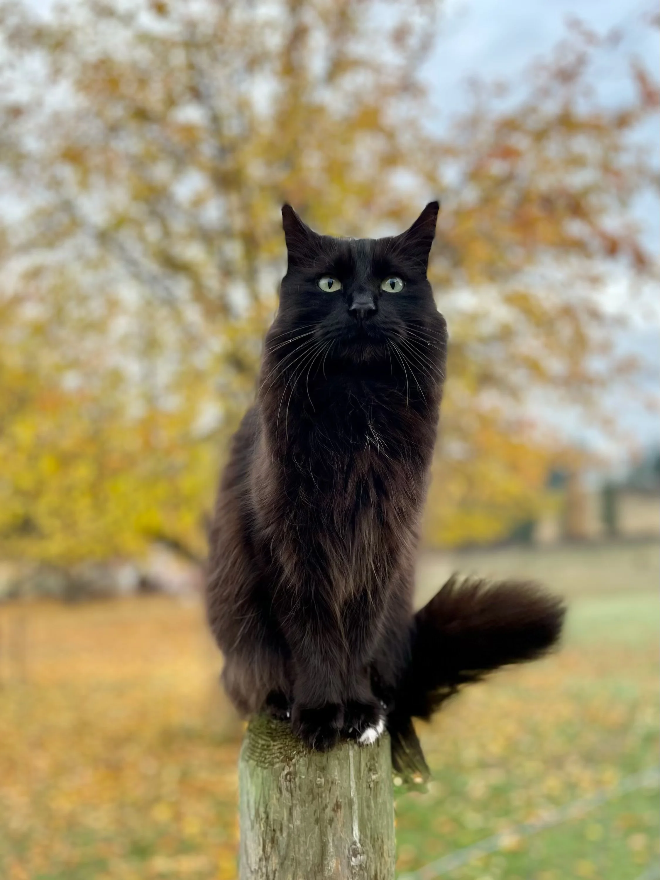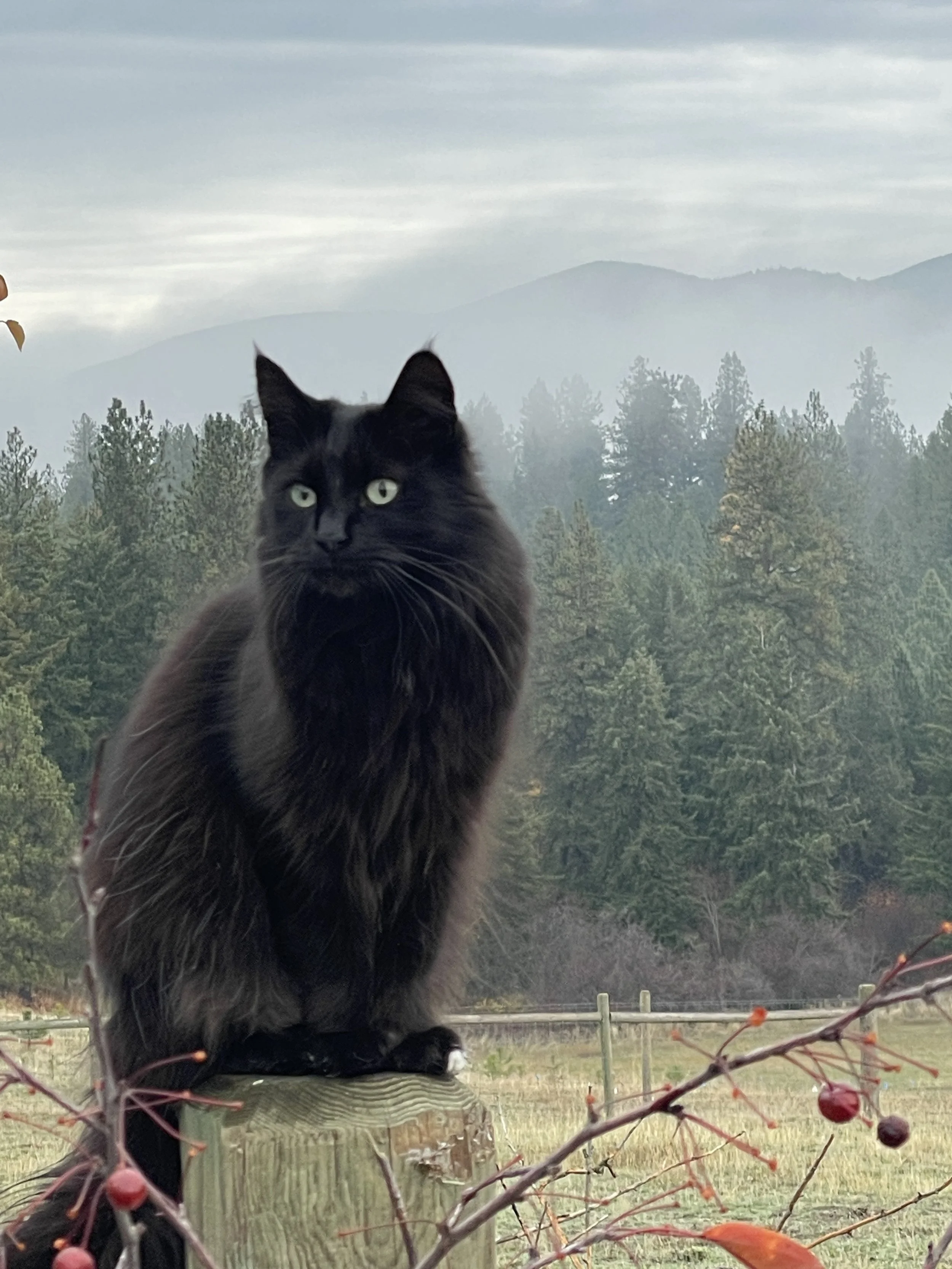 Also unfettered by the misty morning, Montana and Elijah’s fluffy-tailed Baby Cat (actually don’t know if she has an actual name, sometimes I call her Black Cat) was being very photogenic, posing on top of multiple fence posts.
