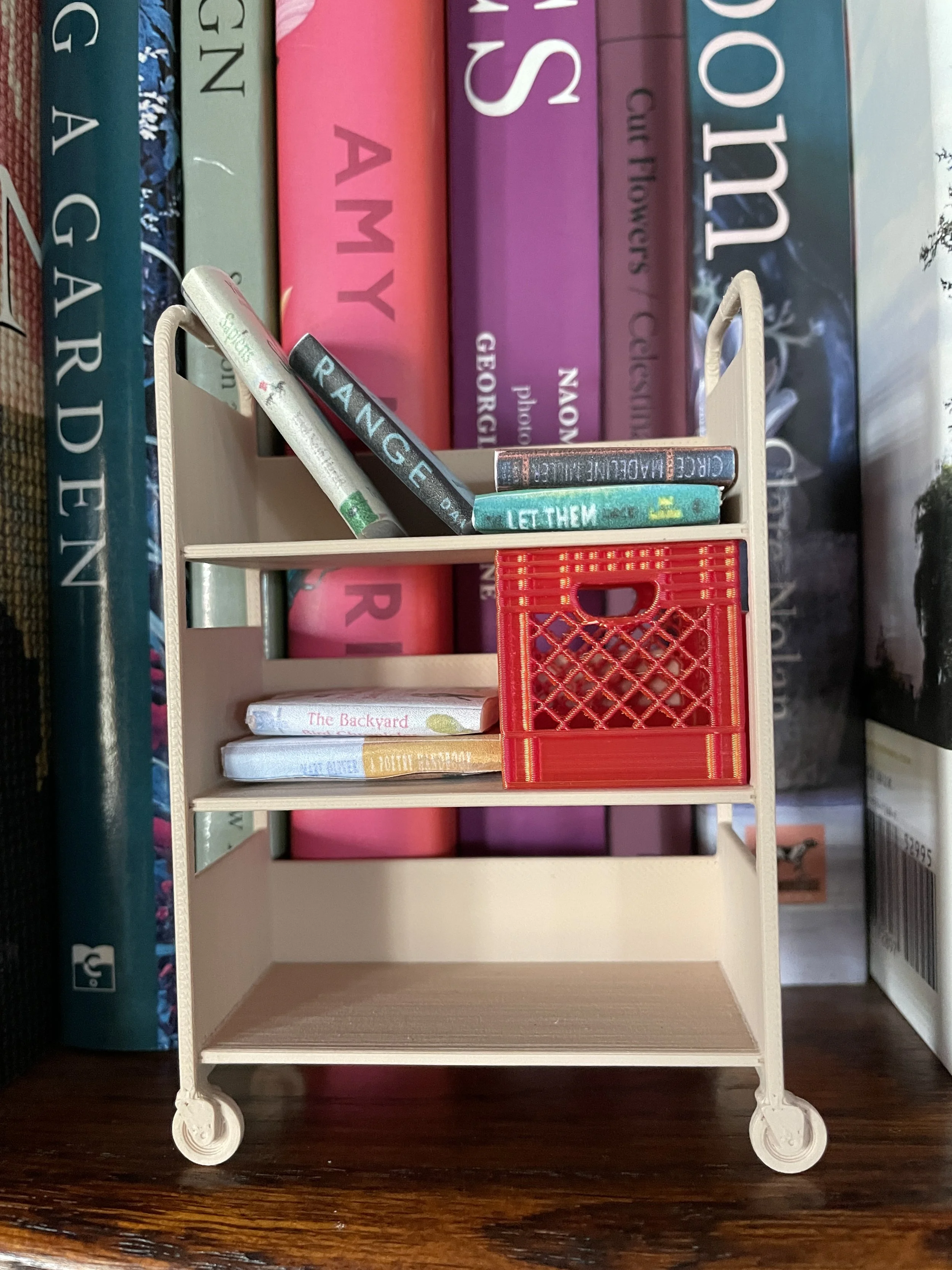 I’ve started in on my summer reading. When I finish a book I make a little tiny version (using foamboard and minaturized images from Amazon) and put it on my little mini library cart that I keep on my library shelf. #crafty #obsession
