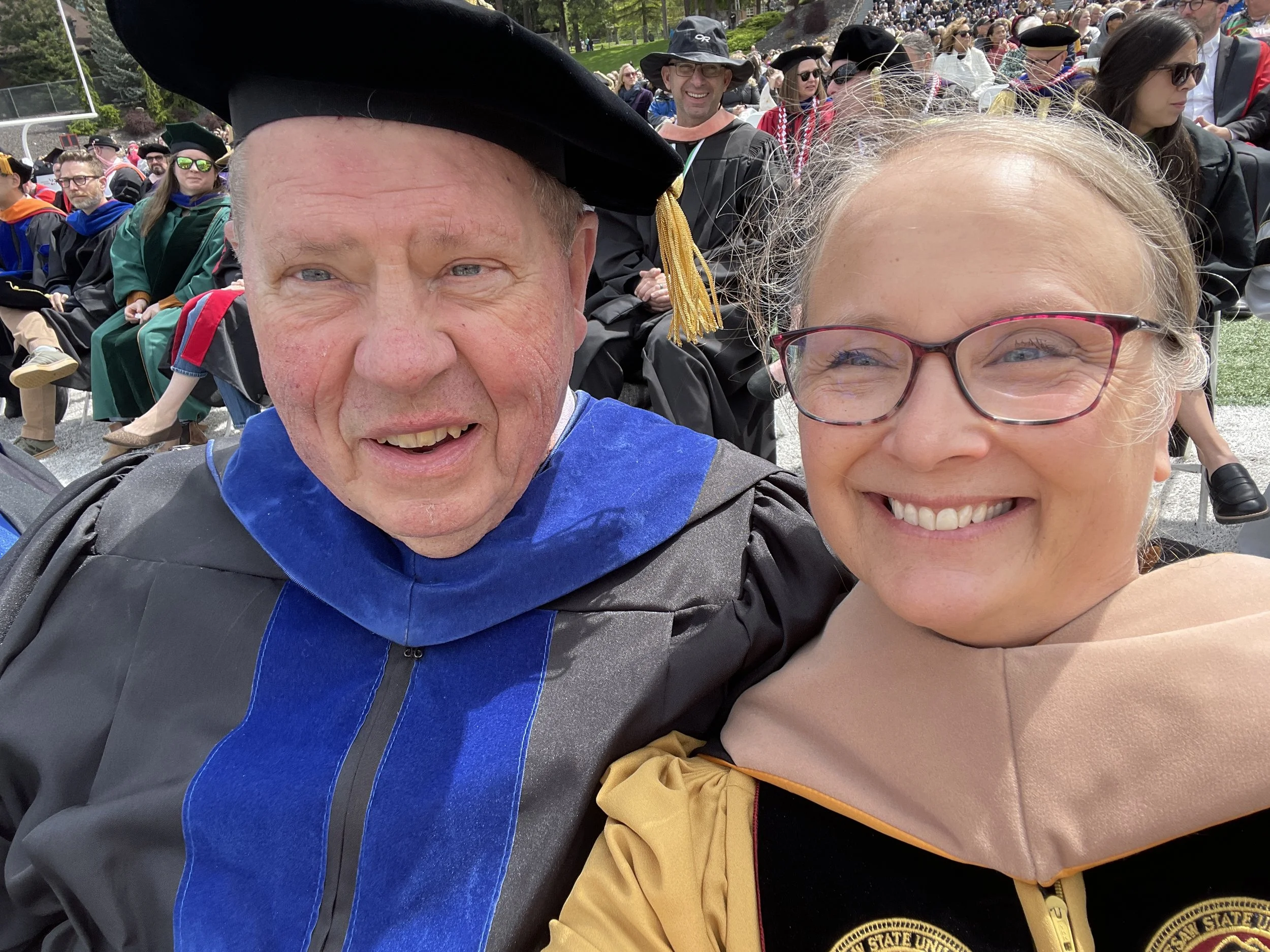 I don’t have my doctoral cap on, so this only qualifies as a very partial regalia photo, but enjoying a very snappy undergraduate graduation ceremony with one of my dear colleagues, Craig Hinnencamp. Graduation is such a happy time for professors, seeing the students with each other and their families. Earning degrees takes a lot of work and support!