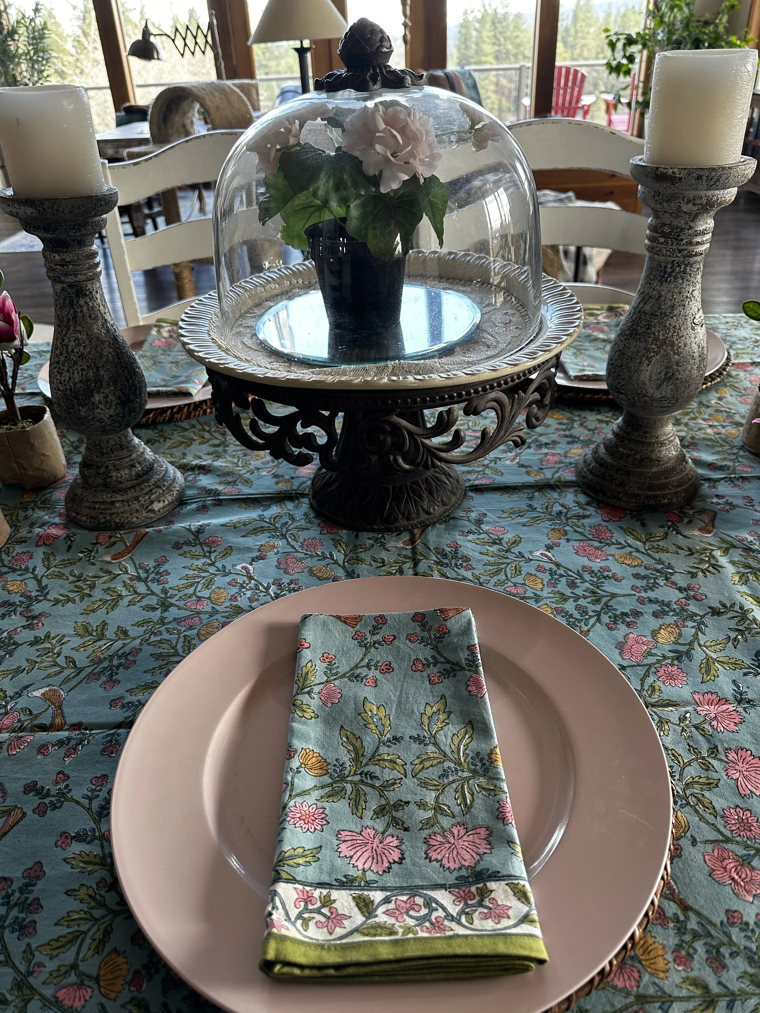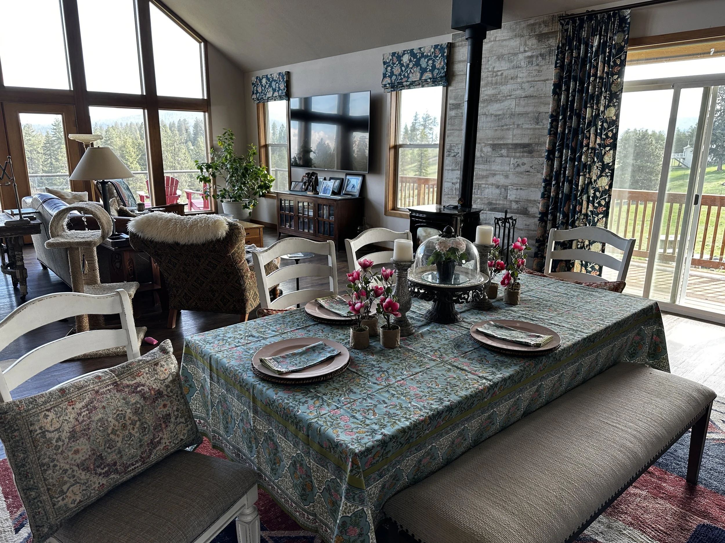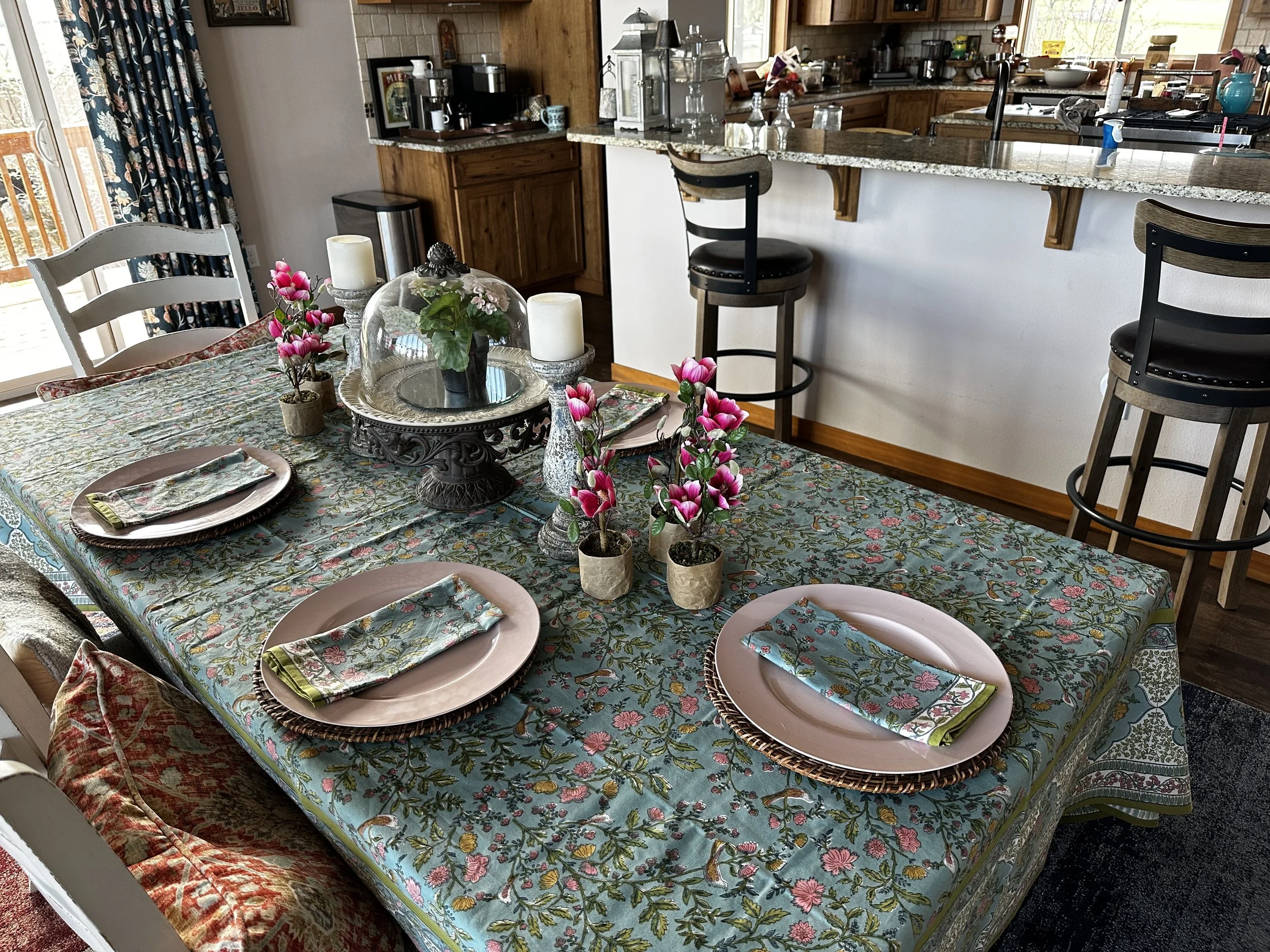 I couldn’t find a spray bottle of water to work out the wrinkles, but a new spring tablecloth just arrived, so it was time for a tablescape refresh. Before we know it the apple trees in the back yard will also be in bloom!