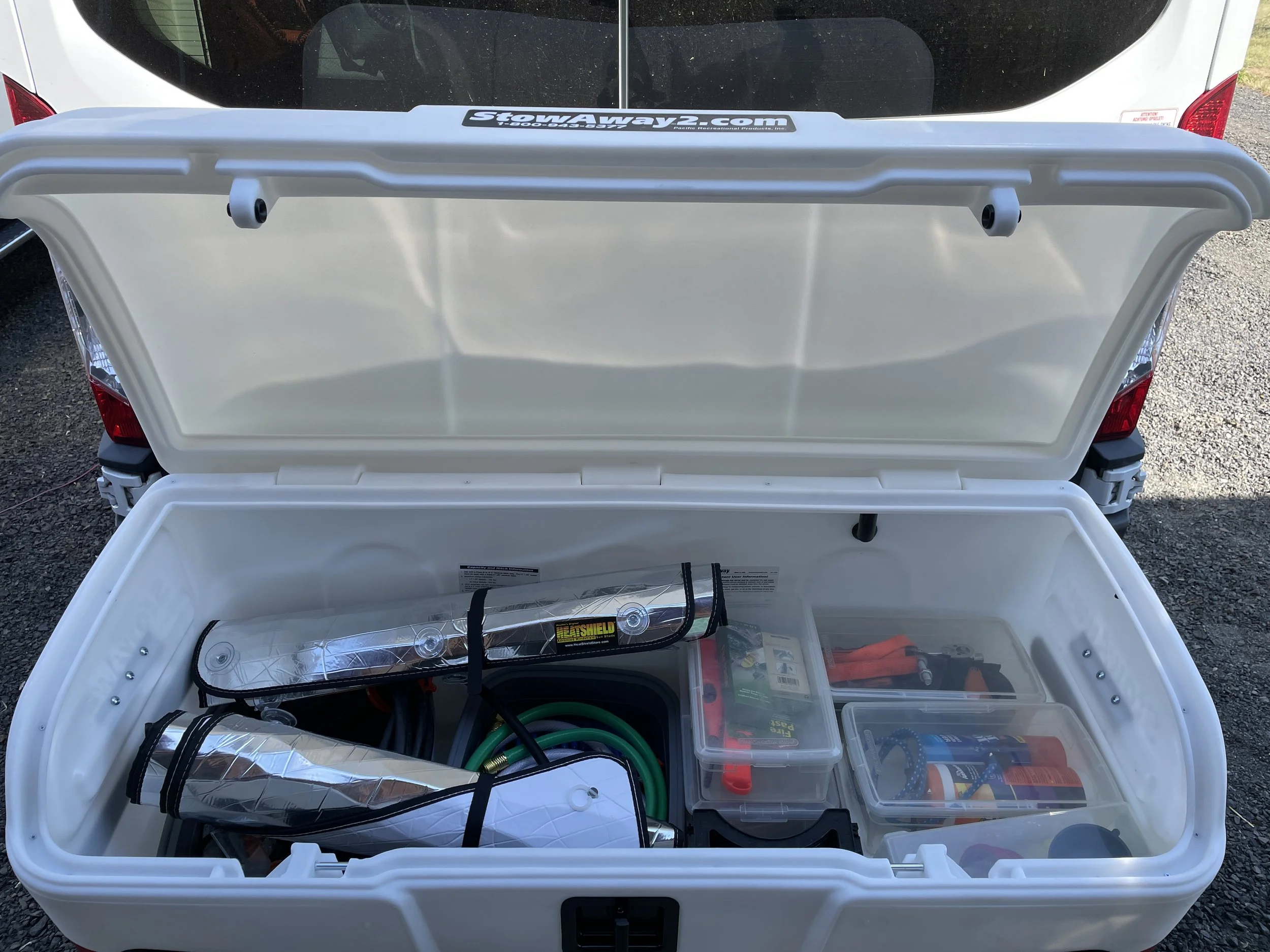 You know how we love storage solutions around here! We tested out having an external storage box on the back of the camper van to hold all of the “infrastructure” items so we don’t have to squeeze them inside. It’s a must-have now.