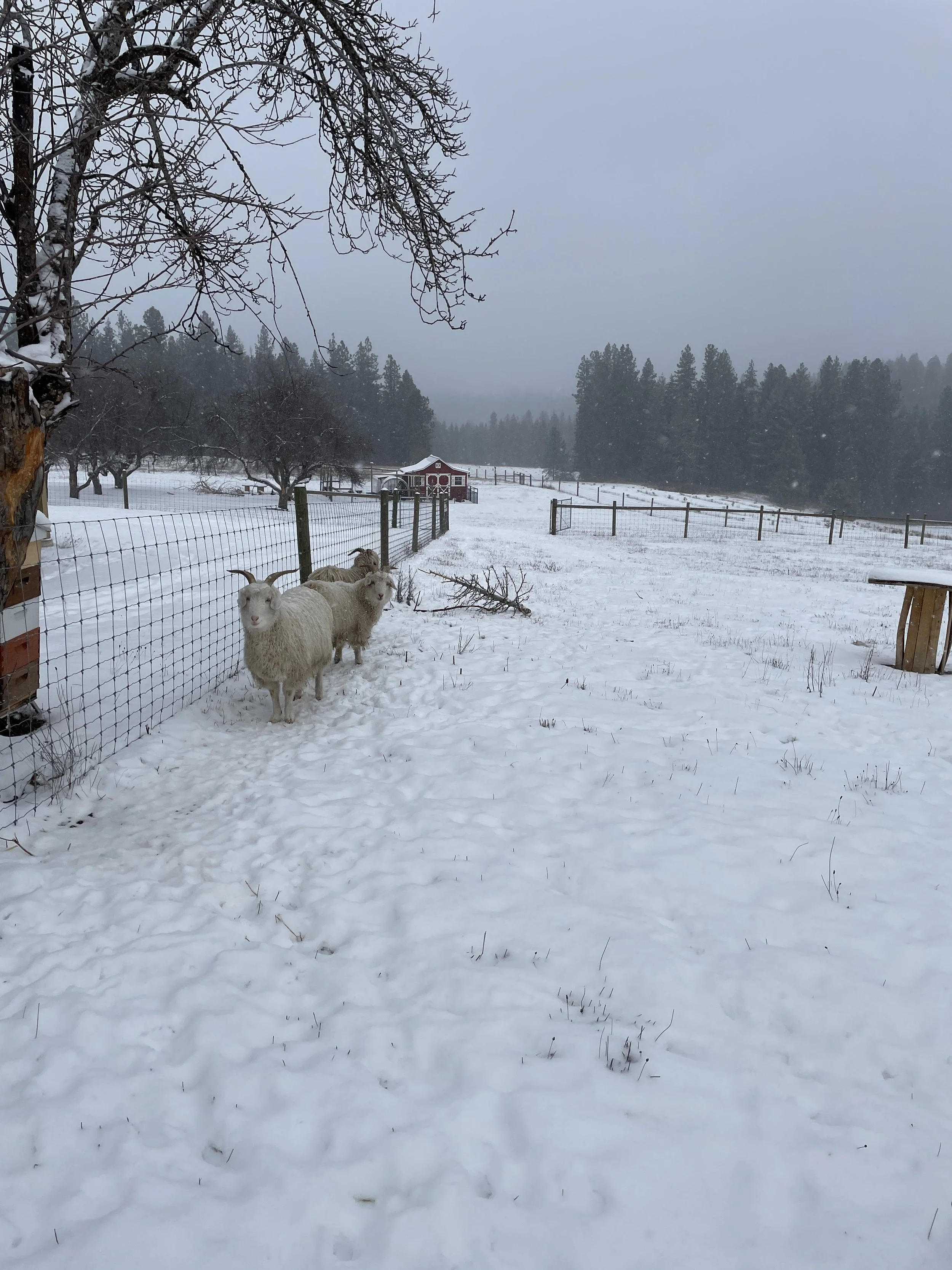 The goats don’t appreciate the snow quite as much as the mini donkeys did, but they still venture out. Also pictured - what is left of one of the Christmas trees!