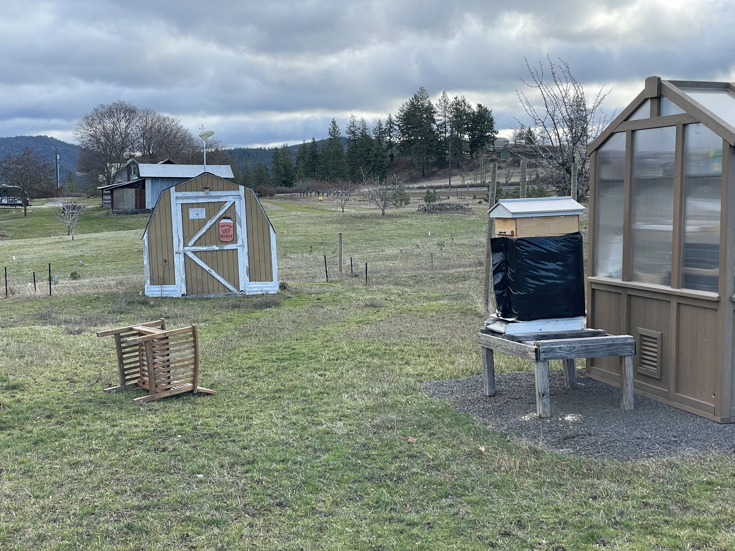 This chair was sitting to the right of the beehive behind the greenhouse. Looks like a gust somehow picked it up and deposited it here.