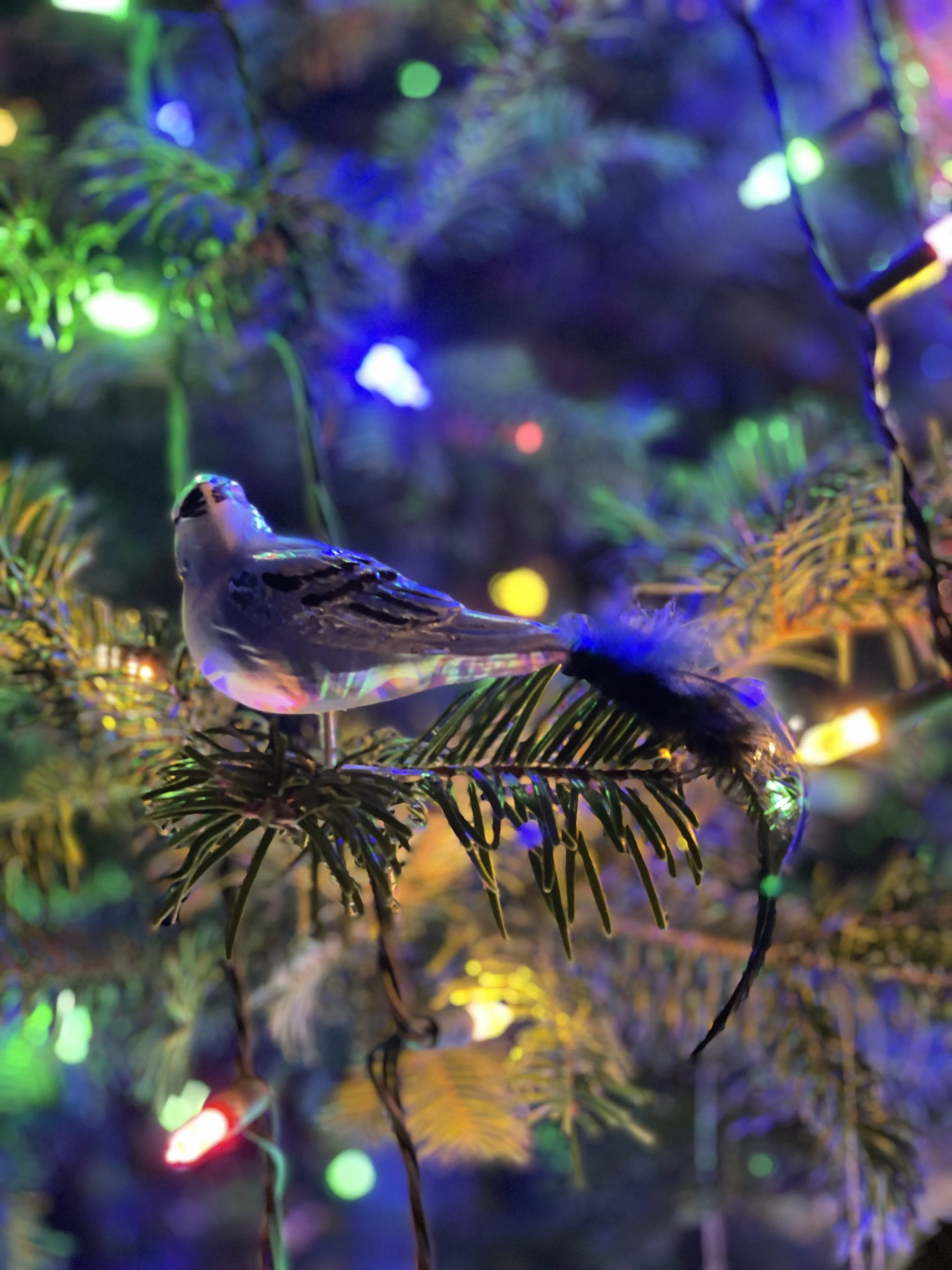 Pre-decorated tree. It’s quite a beauty, and we are enjoying in its new location this year. Our lights can switch between white and colored.
